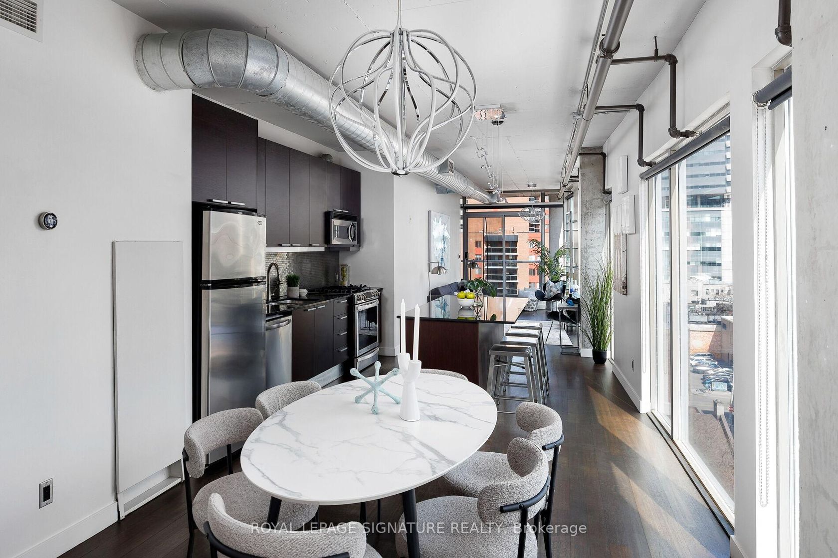 Elevate your everyday in this jaw-dropping 2-bedroom, 2-bathroom designer loft at One Six Nine Lofts where luxury meets art in the heart of downtown Toronto. With 1,047 square feet of impeccably curated space, this rare offering delivers the ultimate in modern urban living. Massive full-length windows frame stunning, unobstructed views of the CN Tower and city skyline, flooding the home with natural light. Step inside and be captivated by industrial-chic elements: exposed concrete ceilings, rich hardwood floors, and sleek imported Italian cabinetry. Brand-new tiles, modern cabinetry, upgraded fixtures, and upscale designer lighting elevate the space with a fresh, modern edge. The open-concept layout, soaring 10-foot ceilings, and chef-inspired kitchen make entertaining effortless and unforgettable. Plus, a fully refurbished HVAC system (completed in 2023) ensures year-round comfort and efficiency. The expansive primary suite offers a true urban retreat, complete with a spa-like ensuite, custom-designed closets, and a stunning mural by internationally acclaimed artist Alex Turco. The spacious 2nd bedroom easily fits a king size bed, while the large balcony provides practical outdoor space. All these features creates a bold, sophisticated backdrop that makes this loft truly one-of-a-kind. Innovation meets convenience with a cutting-edge parking stacker system exclusive to residents. Set within a boutique building of just 45 unique suites, this address places you steps from Toronto's cultural pulse TIFF Bell Lightbox, premier dining, boutique shopping, and vibrant nightlife are all at your doorstep.This is more than a loft its a statement. Secure your place among Toronto's finest.
