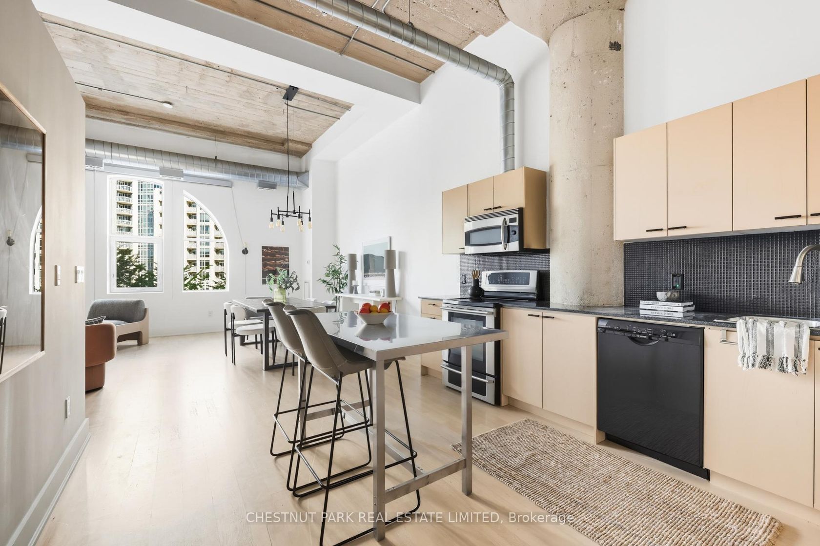 Toronto's iconic Tip Top Lofts with its historic Art Deco frame remains one of the city's most celebrated warehouse-to-residential conversions. The unit boasts nearly 14-foot ceilings and arched windows which cast a soft natural light that tempers the industrial character of true loft living. An expansive open floor plan creates generous flow for living, dining, and entertaining, while the den adapts easily as a home office or guest space. The bedroom provides a serene retreat, proportioned to feel both private and spacious. Directly across the hall, the rooftop terrace extends the living area outdoors with barbecues, dining tables, and loungers overlooking the lake, a rare amenity in a building where many suites lack private outdoor space. Step outside and you're moments from the waterfront trail for morning runs, bike rides, or sunset walks, yet only a short stroll to King West's vibrant dining and nightlife scene. An address where history, architecture, and lifestyle converge, Tip Top Lofts remains a landmark in every sense.