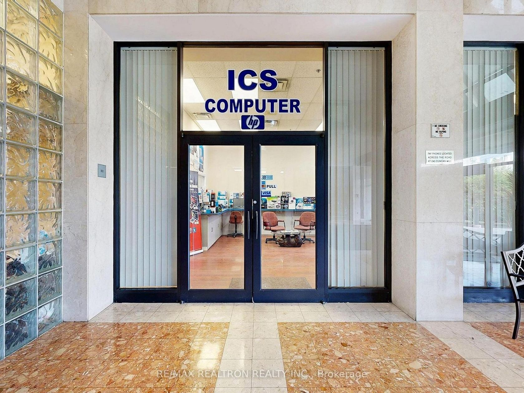 Prime Ground Floor Office Suite In Prestigious 255 Duncan Mill Rd! Approx. 1,036 Sq.Ft. Of Well-Designed Space Featuring A Bright And Spacious Open Area, Two Private Offices, And A Kitchenette/Storage Room. High Ceilings And Large Windows Offer An Abundance Of Natural Light. Situated Right Off The Main Lobby With Excellent Exposure To Both The Lobby And Duncan Mill Road - Ideal For Professional Image And Branding. Well-Maintained, Clean, And Modern Building With Professional Management. Suitable For A Variety Of Professional Uses: Legal, Accounting, Consulting, Tech, And More. Convenient Access To DVP, Hwy 401, TTC, And Nearby Amenities.The office space includes built-in counters, featuring lower cabinets for storage and upper surfaces designed for display.