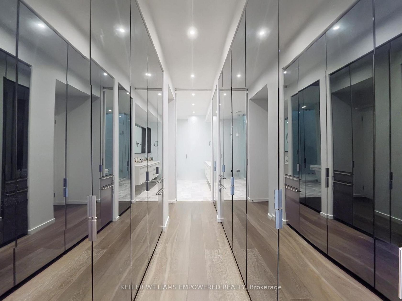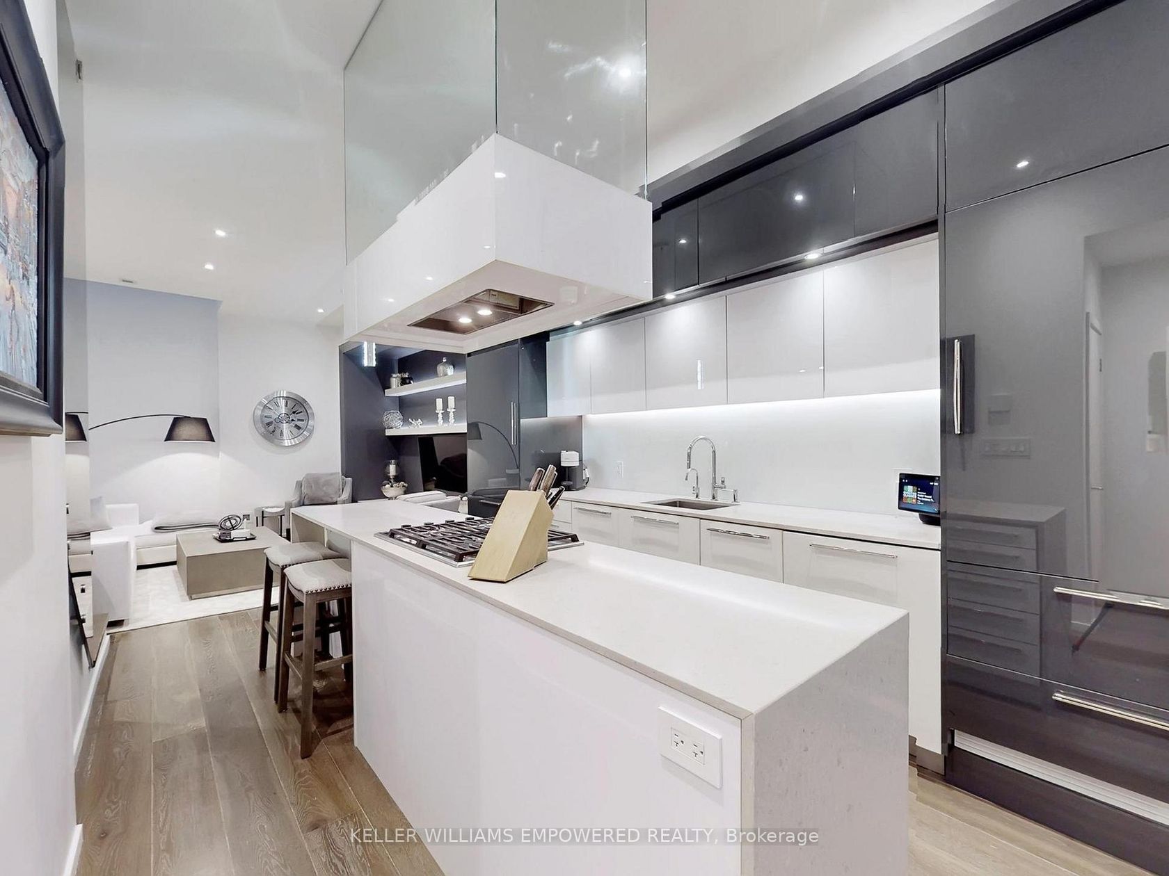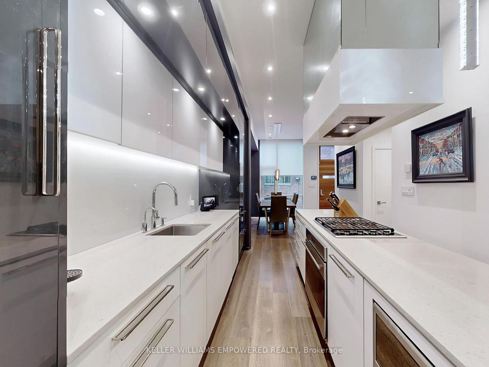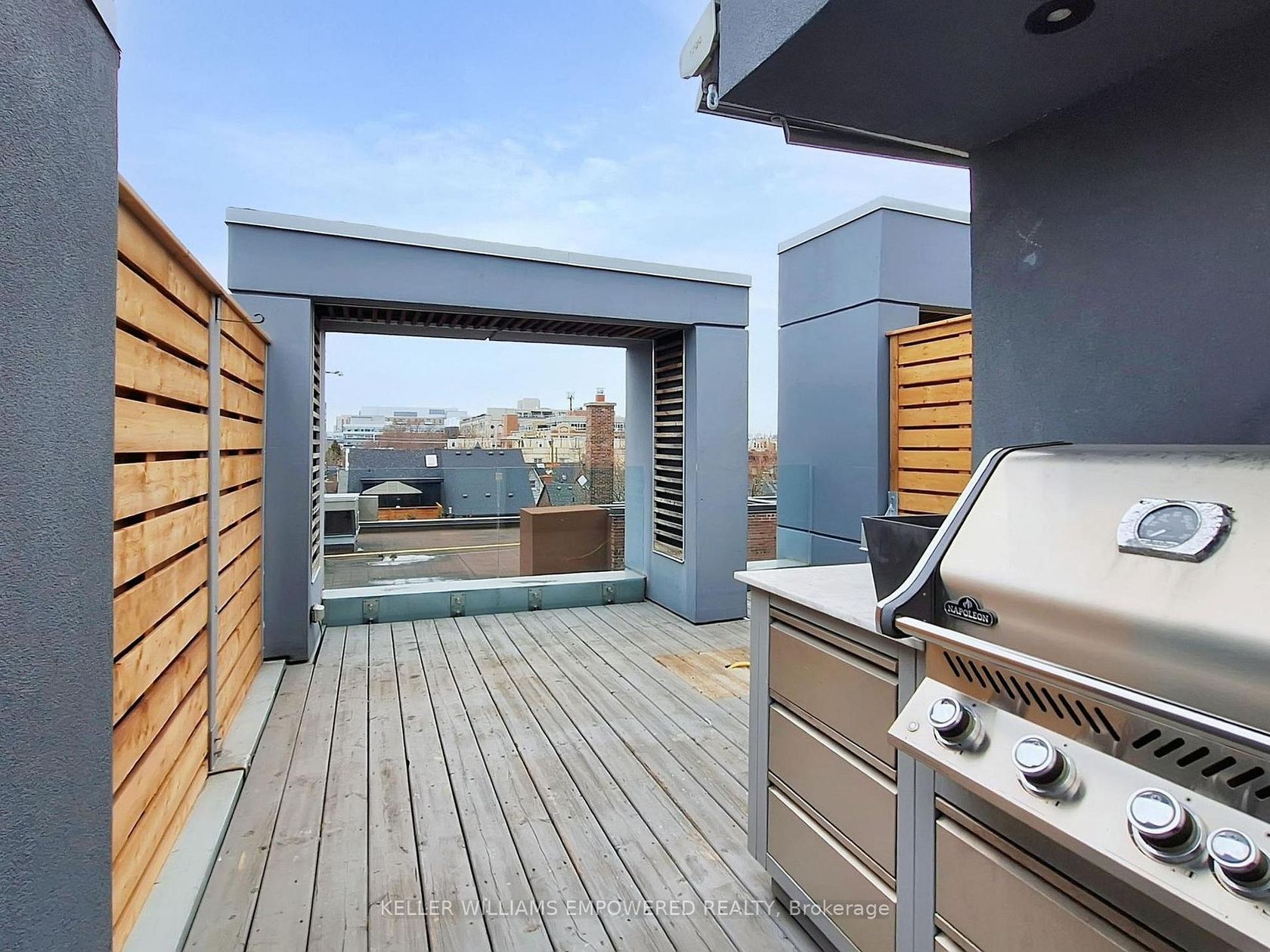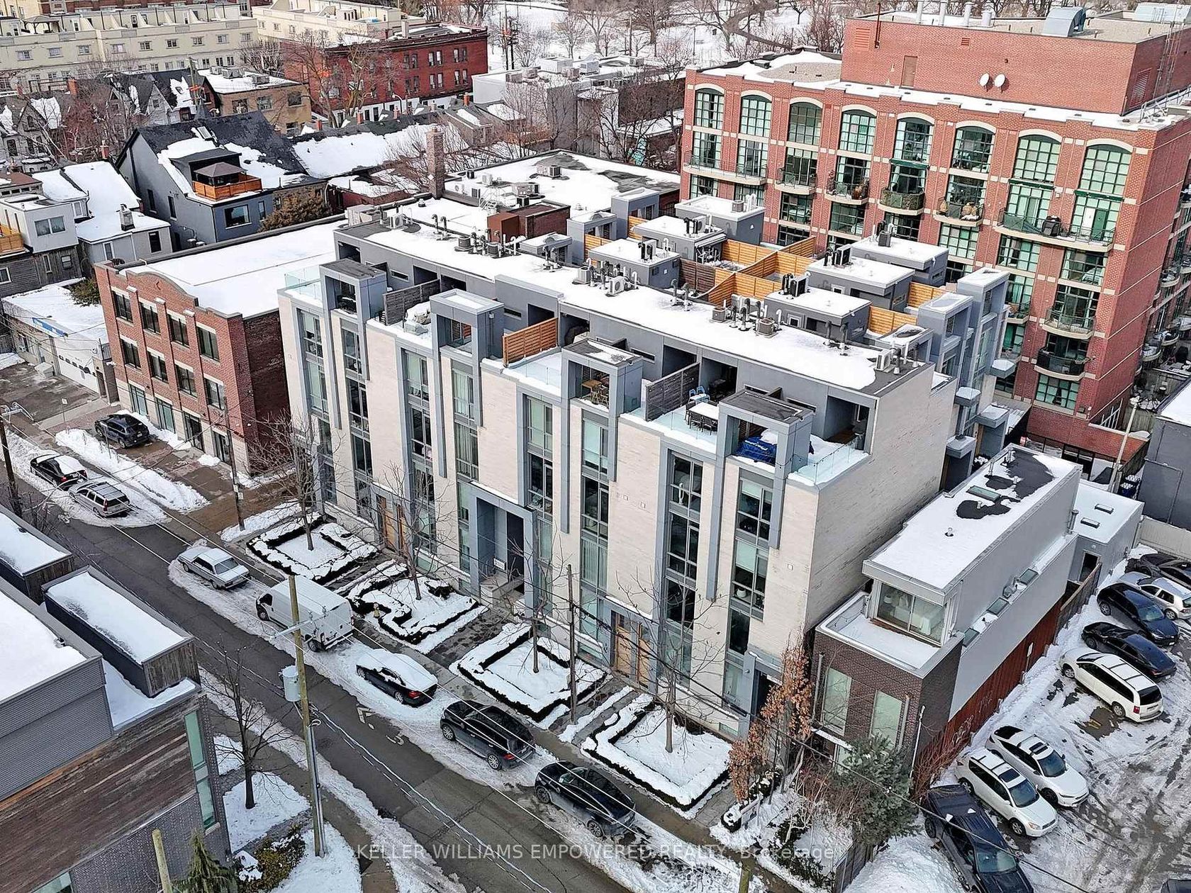 An exceptional multi-level residence offering refined interiors, premium finishes, and a private rooftop terrace with skyline views. The rooftop terrace includes wood decking, glass enclosure for barrier-free city views, wood privacy fencing, covered barbecue and seating areas, and views of the downtown skyline including the CN Tower. The main floor features brushed oak flooring and 10-foot ceilings. The foyer offers a walnut paneled door with glass inset and frosted transom,… and a guest closet. The open-concept dining room overlooks the front grounds through a floor-to-ceiling window and includes pendant lighting, built-in accent shelving with feature lighting, lower cabinetry, and a Sub-Zero dual-temperature wine fridge. The kitchen showcases stone countertops, glass backsplash, valence-lit cabinetry, Sub-Zero fridge/freezer, Asko dishwasher, a centre island with stone waterfall countertop, Wolf four-burner cooktop, Wolf oven, Panasonic built-in microwave, and seating for two. The living room features a skylight and built-in shelving with lower cabinetry. The second level offers a primary suite with floor-to-ceiling window wall, built-in desk and dresser, dressing quarters with mirrored cabinetry, and a marble-floored ensuite with double floating vanity, water closet, soaker tub, and glass-enclosed shower with rain head. The third level includes two bedrooms, one with a Romeo and Juliette balcony. New roof (2026) at seller's expense. Nearby local parks, including Trinity Bellwoods Park and Stanley Park. Within walking distance to a multitude of cafés, boutique shopping, dining and fitness studios along Queen Street, only steps to public transit. A short drive to STAKT Market and The Well, with easy access to Osgoode and King West.