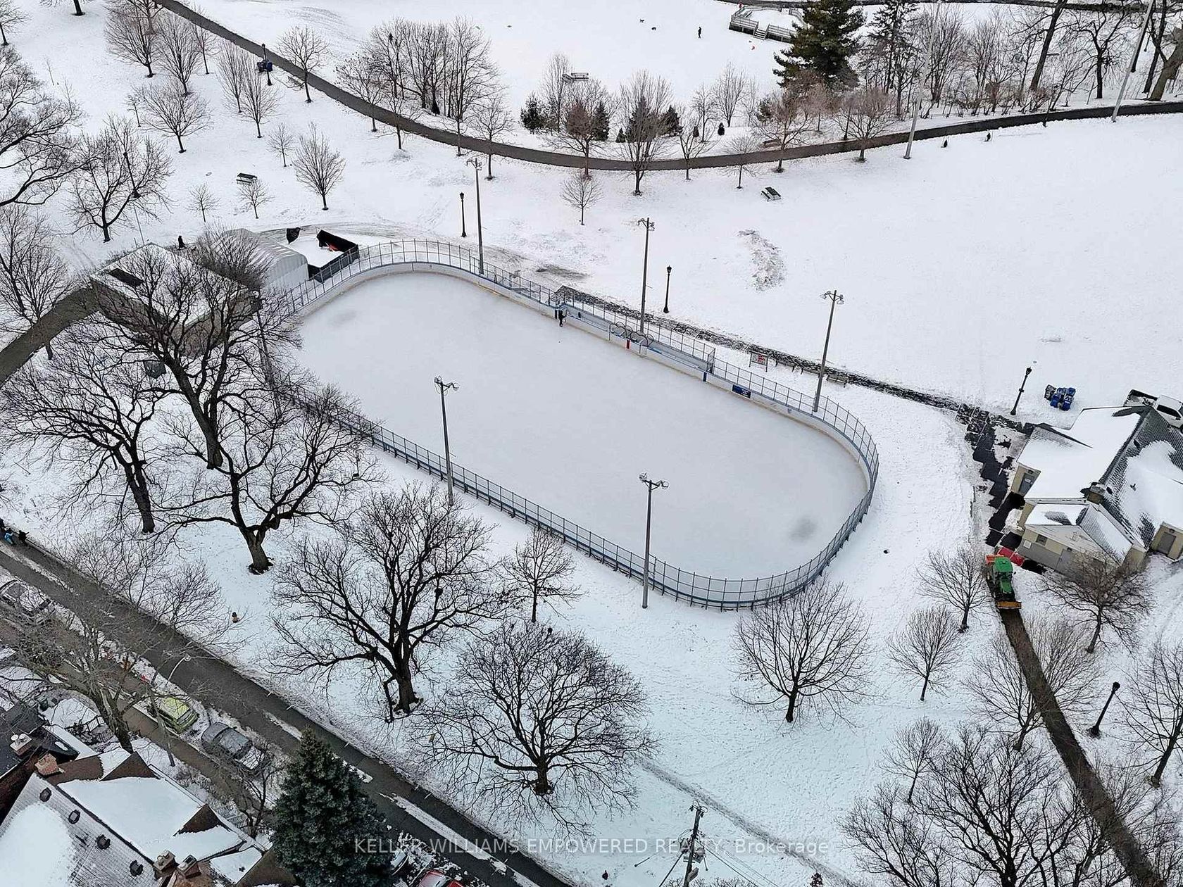 An exceptional multi-level residence offering refined interiors, premium finishes, and a private rooftop terrace with skyline views. The rooftop terrace includes wood decking, glass enclosure for barrier-free city views, wood privacy fencing, covered barbecue and seating areas, and views of the downtown skyline including the CN Tower. The main floor features brushed oak flooring and 10-foot ceilings. The foyer offers a walnut paneled door with glass inset and frosted transom, and a guest closet. The open-concept dining room overlooks the front grounds through a floor-to-ceiling window and includes pendant lighting, built-in accent shelving with feature lighting, lower cabinetry, and a Sub-Zero dual-temperature wine fridge. The kitchen showcases stone countertops, glass backsplash, valence-lit cabinetry, Sub-Zero fridge/freezer, Asko dishwasher, a centre island with stone waterfall countertop, Wolf four-burner cooktop, Wolf oven, Panasonic built-in microwave, and seating for two. The living room features a skylight and built-in shelving with lower cabinetry. The second level offers a primary suite with floor-to-ceiling window wall, built-in desk and dresser, dressing quarters with mirrored cabinetry, and a marble-floored ensuite with double floating vanity, water closet, soaker tub, and glass-enclosed shower with rain head. The third level includes two bedrooms, one with a Romeo and Juliette balcony. New roof (2026) at seller's expense. Nearby local parks, including Trinity Bellwoods Park and Stanley Park. Within walking distance to a multitude of cafés, boutique shopping, dining and fitness studios along Queen Street, only steps to public transit. A short drive to STAKT Market and The Well, with easy access to Osgoode and King West.