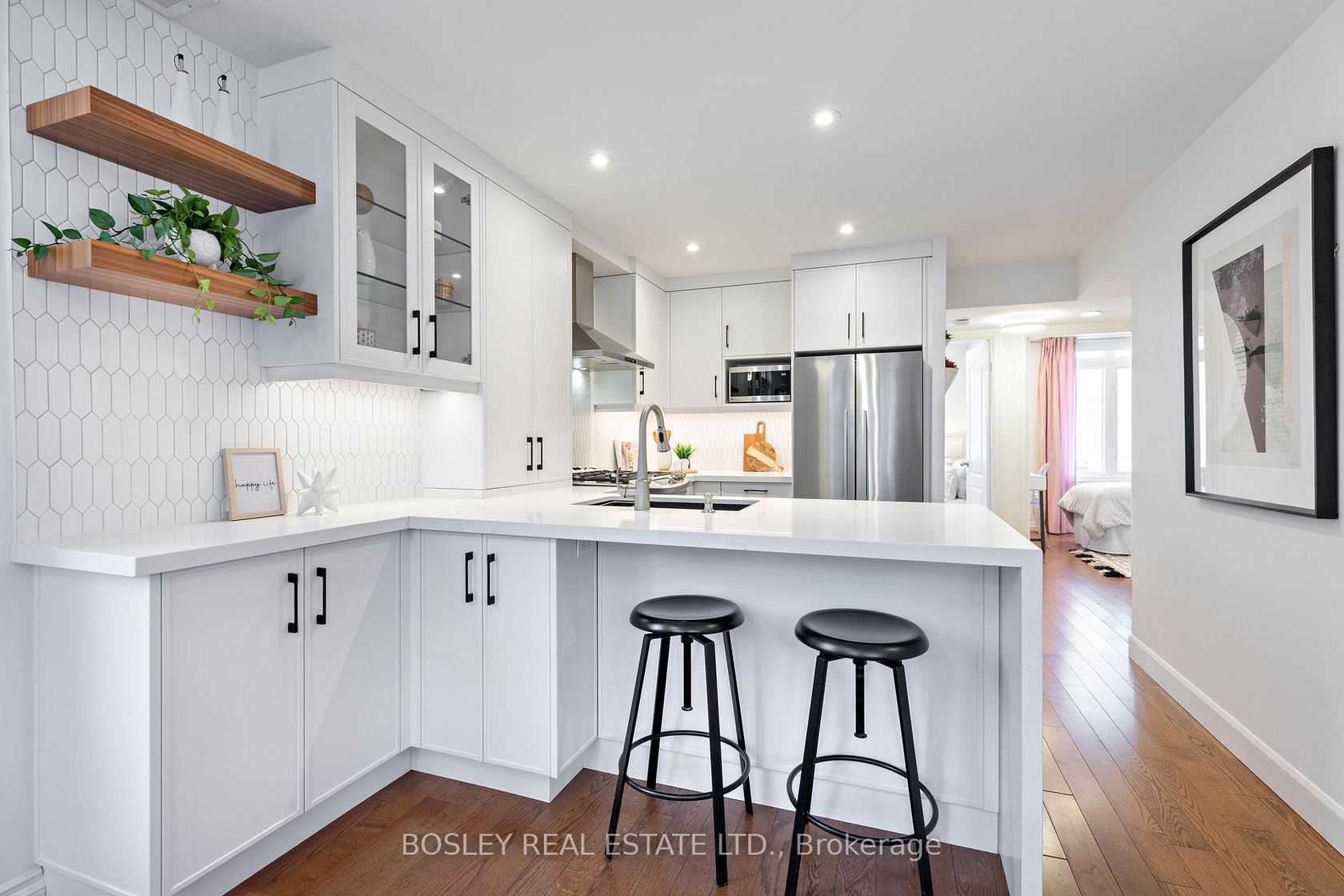 Worth the wait! Stunning, fully renovated, sun-filled corner three-bedroom townhome offering a luxurious King West lifestyle with the convenience of direct access to a large built-in garage and an expansive rooftop terrace ideal for unwinding and entertaining. The heart of the home is an open-concept living and dining space designed for both everyday comfort and hosting, featuring a gas fireplace, breakfast bar seating, and a walk-out to the front balcony-perfect for enjoying… morning sun. The custom kitchen is anchored by a granite waterfall countertop, custom cabinetry built to the ceiling, a gas stove, a thoughtfully designed coffee bar extension, and ample storage including a dedicated pantry, combining style with exceptional functionality. Upstairs, the generous primary retreat impresses with a walk-in closet, spa-like ensuite, and direct walk-out to the approximately 240 sq ft west facing rooftop terrace-an exceptional private outdoor space complete with a gas BBQ hookup and water line, ideal for outdoor living and entertaining. Two additional bedrooms offer flexibility, including a main-floor bedroom with a built-in office nook, making it perfect for a multi-purpose bedroom and convenient work-from-home space. Thoughtful upgrades throughout include gorgeous hardwood floors, smooth ceilings with pot lights, high-end fixtures, and the complete professional removal of Kitec plumbing. Additional storage is found in the large under-stair storage area at the entry to the garage, along with the convenience of an EV charger rough-in. The home is further enhanced by a Google smart home system including door lock, doorbell camera, thermostat, and smoke/CO detectors. All of this is nestled in a fantastic King West location, just steps to TTC on King and Queen, minutes to Trinity Bellwoods Park, Ossington's vibrant restaurant scene, grocery stores, gyms, and easy access to the lakefront. Truly exceptional urban living.