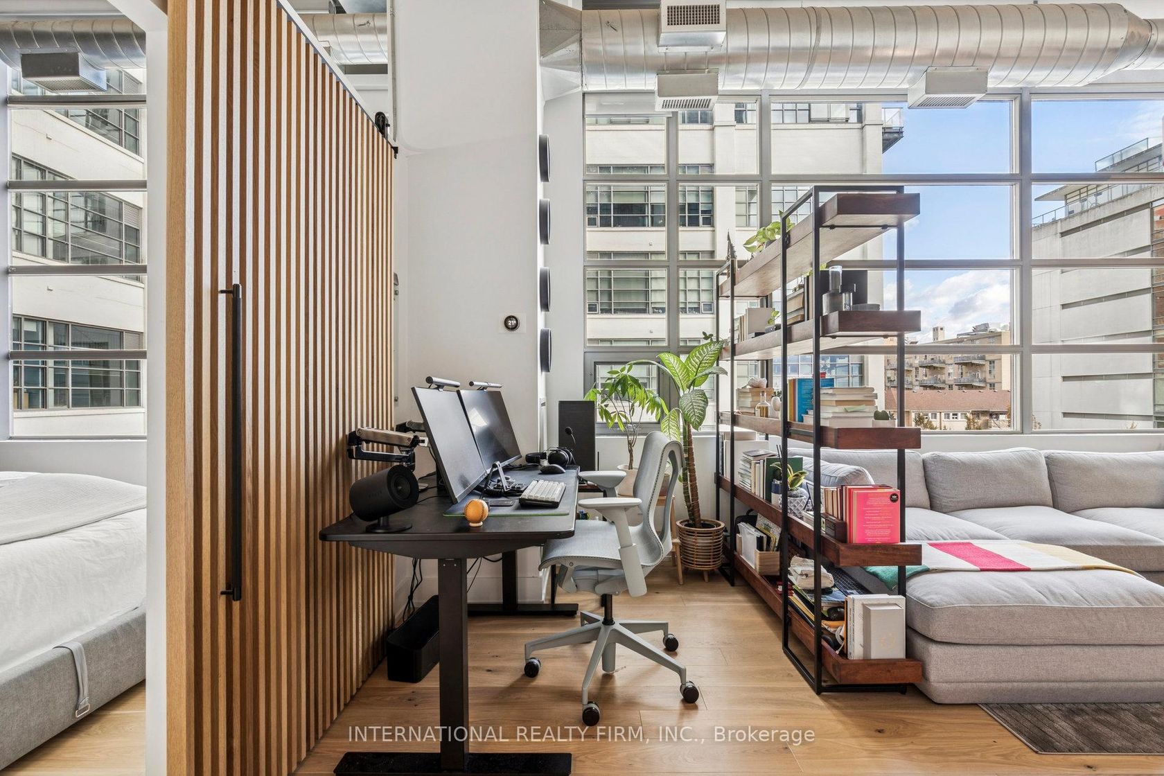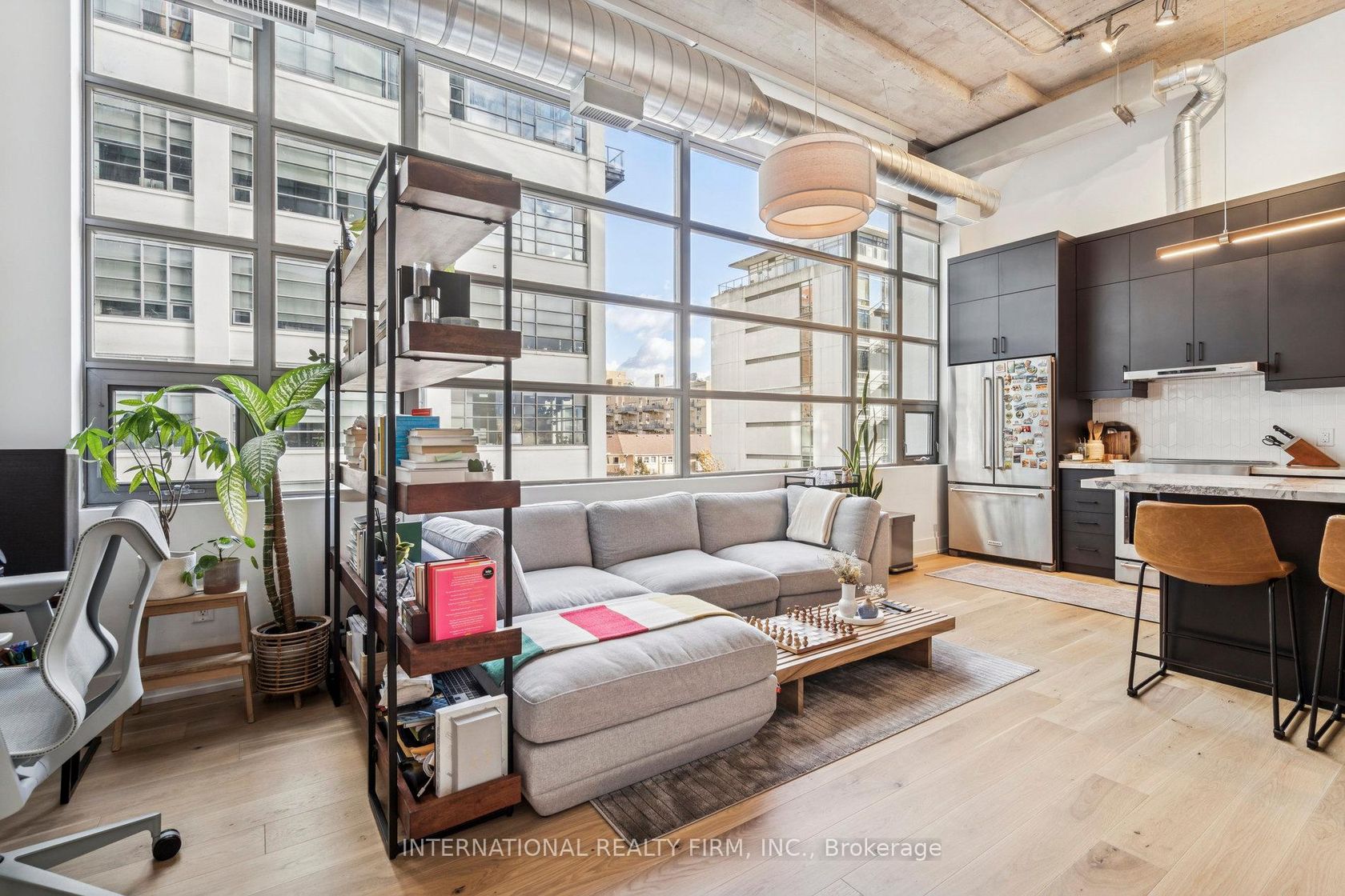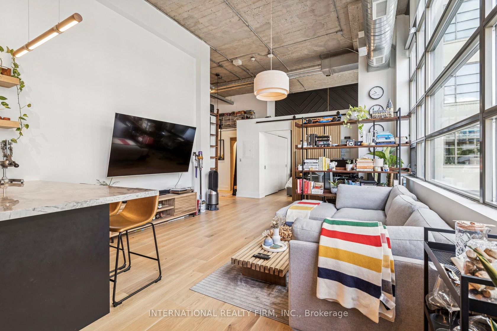 Step into a truly unique home at the iconic Tip Top Lofts. This fully renovated, light-filled suite stands apart with rare large windows that stretch the entire length of the unit - including a windowed bedroom, a feature seldom found in the hard loft portion of the building. With soaring 13 ft 2 in ceilings, the space feels bright, airy, and effortlessly stylish. The kitchen has been completely reimagined around a sleek peninsula island, perfect for casual dining or entertaining. Natural quartzite stone runs throughout the entire unit - in both the kitchen and bathroom - adding timeless beauty and durability. A built-in wine fridge, designer lighting, new flooring, and custom cabinetry elevate the home even further. The spa-inspired bathroom features heated floors, Kohler fixtures, quartzite counters, and striking Buster & Punch hardware. Custom 1928 Workbench doors in both the bathroom and bedroom pay homage to the building's heritage, while a custom bedroom feature wall and motorized blinds add comfort and sophistication. A generous mezzanine sits above the bathroom, offering endless versatility. A custom 1928 Workbench ladder system was also designed and installed to provide seamless access to the mezzanine and upper storage areas. Additional storage is thoughtfully integrated above the laundry closet and front foyer, alongside a custom front cabinet with added seating and shelving. This loft also includes a rare convenience: a parking spot already equipped for EV charging (Tesla Charger is excluded). Every detail has been considered in this top-to-bottom renovation, blending craftsmanship with functionality for a truly elevated loft lifestyle. A rare opportunity to own a beautifully redesigned, character-rich home in one of Toronto's most celebrated historic buildings.