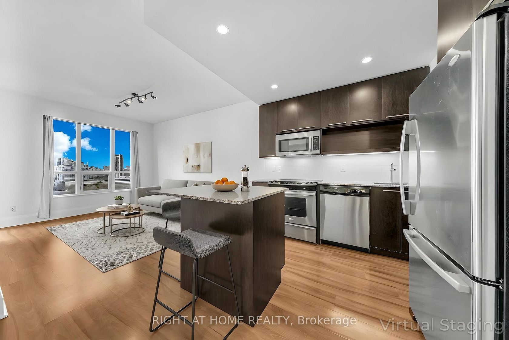 Experience elevated city living in this bright one-bedroom plus den condo featuring spectacular northwest city and park views from a high floor on the quiet side of the building, away from highway noise. Step out onto your private open-air balcony to relax and enjoy sweeping unobstructed views overlooking the surrounding parks and playgrounds. The thoughtfully designed layout includes a spacious den, large enough to function as a guest room, nursery, dining area, or home office, offering exceptional flexibility to suit your lifestyle. The modern kitchen features full-size stainless steel appliances, including a bottom-freezer fridge, a slide-in electric cooktop and oven, and a microwave oven with range hood. Enjoy the convenience of an ensuite front-load laundry, mirrored sliding closet doors, and window coverings and light fixtures. This meticulously maintained, pet- and smoke-free suite also includes a premium parking space located just steps from the elevator entrance. Ideally located within walking distance to public transit, park, playground, and a nearby elementary school, with quick access to Highways 401 and 404 and the subway line. Don't miss the nearby shopping, local eateries, and everyday conveniences. Residents also enjoy an impressive clubhouse with an indoor pool, fitness centre, sauna, theatre room, library, party and dining rooms, billiards, and guest suites.