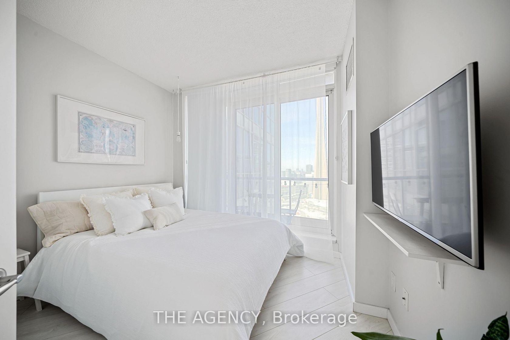 Stylish Condo Living Just Steps From the Lake! A Charming Juliette Balcony Welcomes You Into This Bright and Impeccably Maintained Suite Offering Refined Condo Living Just Moments From Toronto's Vibrant Harbourfront. Completely Move in Ready, This Home Offers; the Perfect Blend of Comfort, Style, and Convenience. Featuring; 9 Ft Ceilings, Upgraded Laminate Flooring Throughout With No Carpet, a Well Maintained Cabinetry, and a Thoughtfully Designed Open Concept Layout. The Spa…ce is Ideal for Both Everyday Living and Effortless Entertaining. Floor to Ceiling Windows Allow Natural Light to Pour Throughout the Home, Filling the Space With Warmth and an Elegant, Welcoming Feel Throughout the Day. The Spacious Primary Bedroom Serves as a Peaceful Retreat, Complete With a Coveted Walk in Closet and Blackout Blinds for Added Comfort. The Modern Bathroom is Finished With Tasteful Touches, While Ample Storage Throughout the Suite Ensures Practicality and Ease of Living. A Large Ensuite Laundry Adds to the Everyday Convenience, and Two Wall Mounted Tvs Are Included, Making This Home Truly Turnkey. Residents Enjoy Access to Exceptional Resort Style Amenities, Including Indoor and Outdoor Pools, a Fully Equipped Fitness Centre, Sauna, Elegant Party Spaces, and 24 Hour Concierge Service. Perfectly Positioned Just Steps From Lake Ontario and the Harbourfront, This Residence Offers an Unmatched Walkable Lifestyle With Easy Access to Transit, Restaurants, Shopping, Scotiabank Arena, Rogers Centre, and the Financial and Entertainment Districts. A Perfect Opportunity to Enjoy Stylish City Living With the Lake Right at Your Doorstep.