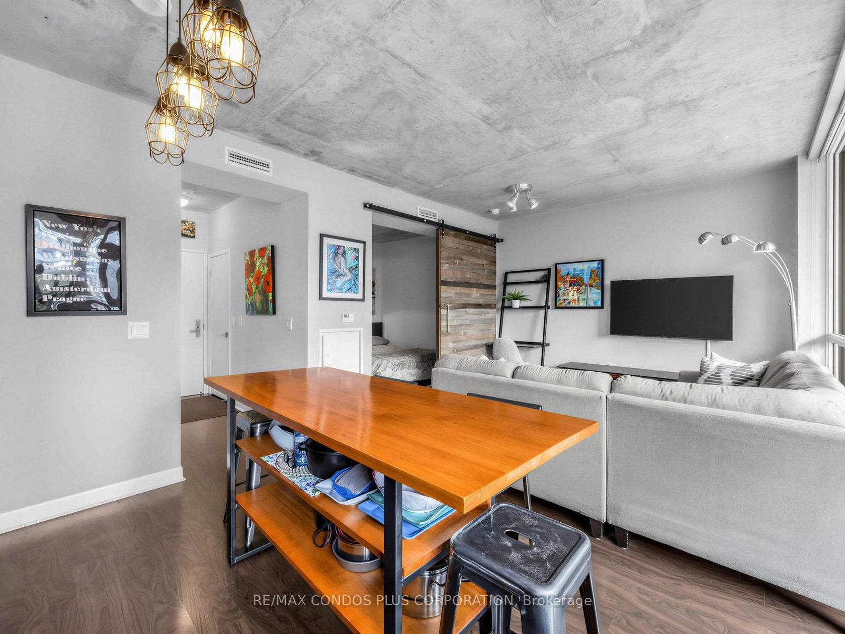 Beautiful and bright south facing one bedroom/one bathroom corner unit at Victory Condominiums a boutique 12 story loft style building nestled in vibrant King West location downtown Toronto. Meticulously maintained by the original owner and great sense of space with no cumbersome structural pillars in the unit to obstruct flow and diminish functionality. Floor to ceiling windows, modern kitchen with built in appliances, granite counters, wood flooring and concrete high ceilings. Bedroom has large closet and private rustic wooden loft style sliding barn door. Step out onto the huge 160 square foot sun drenched private covered balcony facing the inner courtyard and set back from the street to enjoy morning coffee, intimate dinners or cocktails with friends. Enter the private entrance and 24/7 concierge greets your guests in stunning modern lobby. Enjoy the luxury amenities like gym, party room and guest suite that add to the appeal of this property. Step out the front door to award winning renowned restaurants and shopping of King & Queen West and 24 hour transit. Entertainment & Financial districts and The Well all in close proximity. Be part of the excitement as TIFF takes over King West early September. Easy access to Martin Goodman Trail, Billy Bishop Island Airport, Gardiner and Lake Shore highways. *** Investors can purchase fully furnished at additional package price or first time buyer/end user can purchase any furnishings separately to maintain the beautiful and functional space created by the current owner.