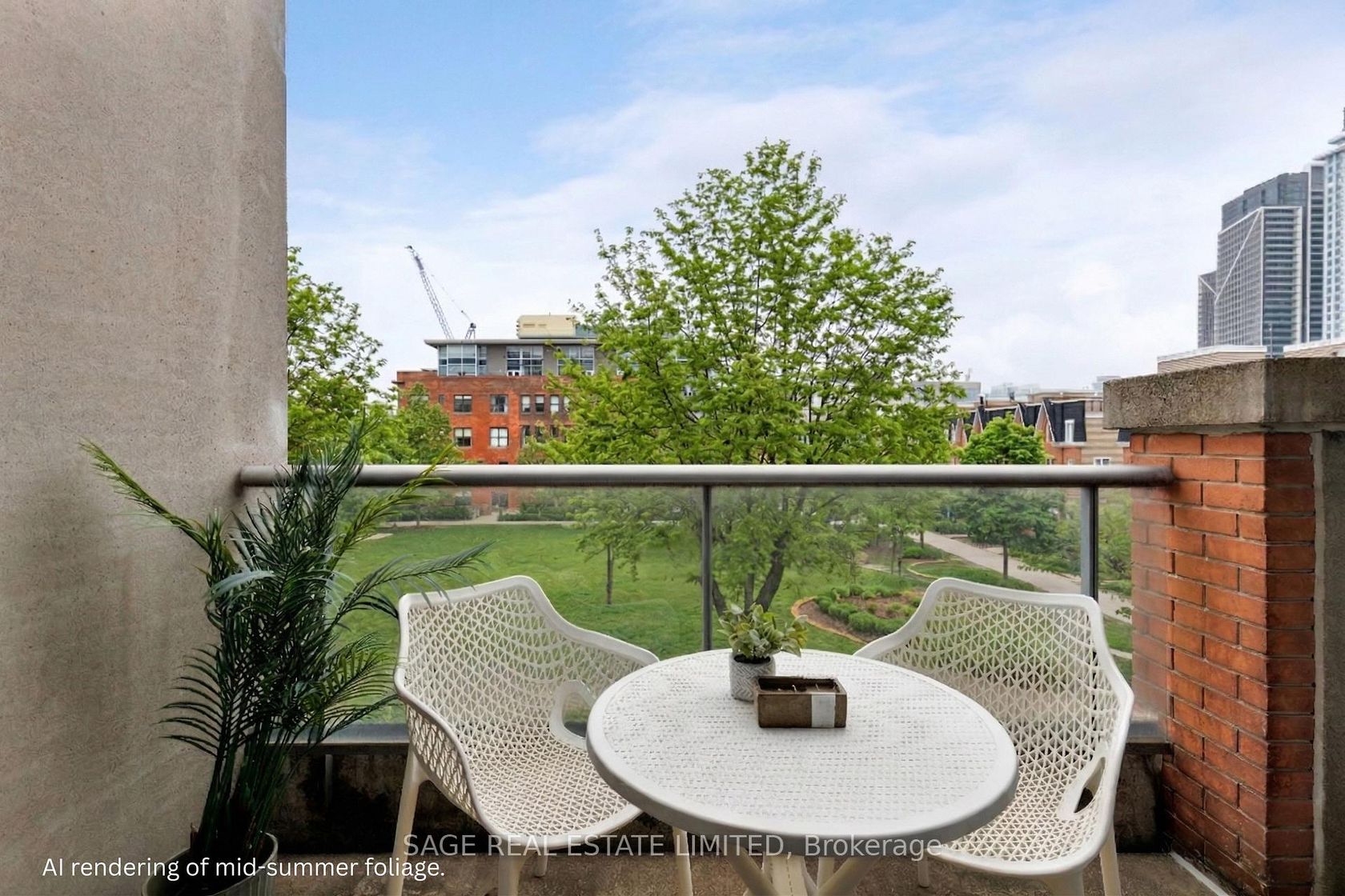Tucked quietly above King St West, that good-part stretch where the city hums but never overwhelms, sits this rarely offered two-storey residence. Perched at tree level, it meets the birds eye-to-eye over Massey Harris Park. Not a townhouse. Not a typical condo. Something far more rare. Meet unit 332, on the market for the first time in 17 years. The scale hits you immediately. Generous, intentional. The layout is open, but not predictable. A dramatic living room is anchored …by a striking East-facing view over the park's treetops, with a footprint designed for the kind of sofa you actually want to come home to. Built-ins add function and polish while pot lights on dimmers shift the mood from bright mornings to slower evenings. Step out to the balcony or leave it open just to hear the buzz of the city. A large bedroom sits just off the living space with custom barn doors that open for flow or close for privacy. The kitchen is purposeful and spacious (no narrow galley feel here) with a full suite of new LG appliances, Kohler country sink, and wine fridge. It's the kind of kitchen that actually makes you want to cook. A separate den adapts to whatever your life calls for: Dining room? Cozy TV nook? Work-from-home zone? You decide. Upstairs, the primary suite feels like its own retreat. Big enough for a California King and everything that goes with it, it holds the walk-in closet, a 4-piece bath, and a jacuzzi bathtub with a view. Then, what sets this home apart: two walkouts open to nearly 300 square feet of private terrace where the view expands beyond the park to a full skyline anchored by the CN Tower. Atop the building's podium, a solid concrete parapet frames the terrace to feel like a fenced backyard in the sky. Gas line, hose bib, multiple drains, space to garden, host, or simply be. With light moving from East to South, everything here has room to grow. Even you.