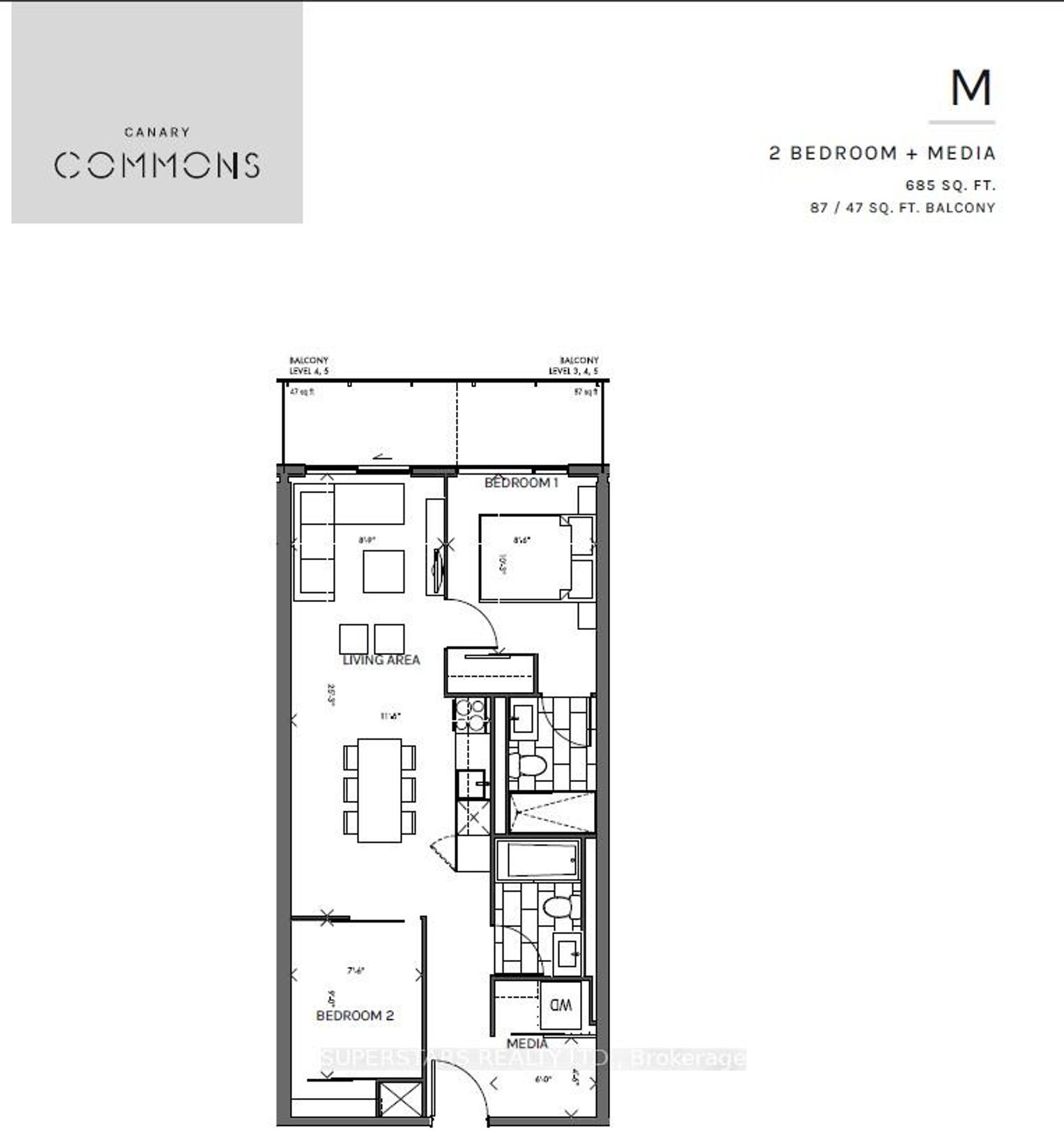 **BEST VALUE WITH PARKING & LOCKER and a layout that is rarely offered at this 4 year old condo in the Canary Commons** | The most practical floor plan with 2 bedrooms, 2 full bathrooms plus a media unit (can fit a desk) | Freshly painted throughout with white oak laminate flooring, contrasted by matte black hardware for a sleek contemporary finish | Kitchen features a built-in refrigerator, freezer and dishwasher, with soft-closing drawer slides | Primary bedroom offers a 4-piece ensuite bathroom with shower stall and double mirrored closets | Floor to ceiling windows throughout the unit offer plenty of sunlight | Unwind on your expansive west-facing balcony, offering glimpse of the CN Tower | Beyond your suite, you'll find abundant amenities: gym, theatre, co-working space, children's playroom, party room, outdoor terrace | Unit is located on podium level, allowing you to take stairs as an alternative to waiting for the elevator | Very well-managed building with low maintenance fees (less than $1 PSF) and on-site management staff to quickly address concerns | Take a stroll to the nearby Corktown Commons park or drop by Marche Leo's for a quick grocery run right at the retail level of your building! | Minutes walk to The Distillery District and waterfront | Easy, quick drive to the Gardiner and DVP | Bonus: The Waterfront East LRT expansion was recently announced, offering future growth and potential in this urban hub | If you prefer a quiet, serene lifestyle while still being a short commute to the downtown core, then this unit is for you!