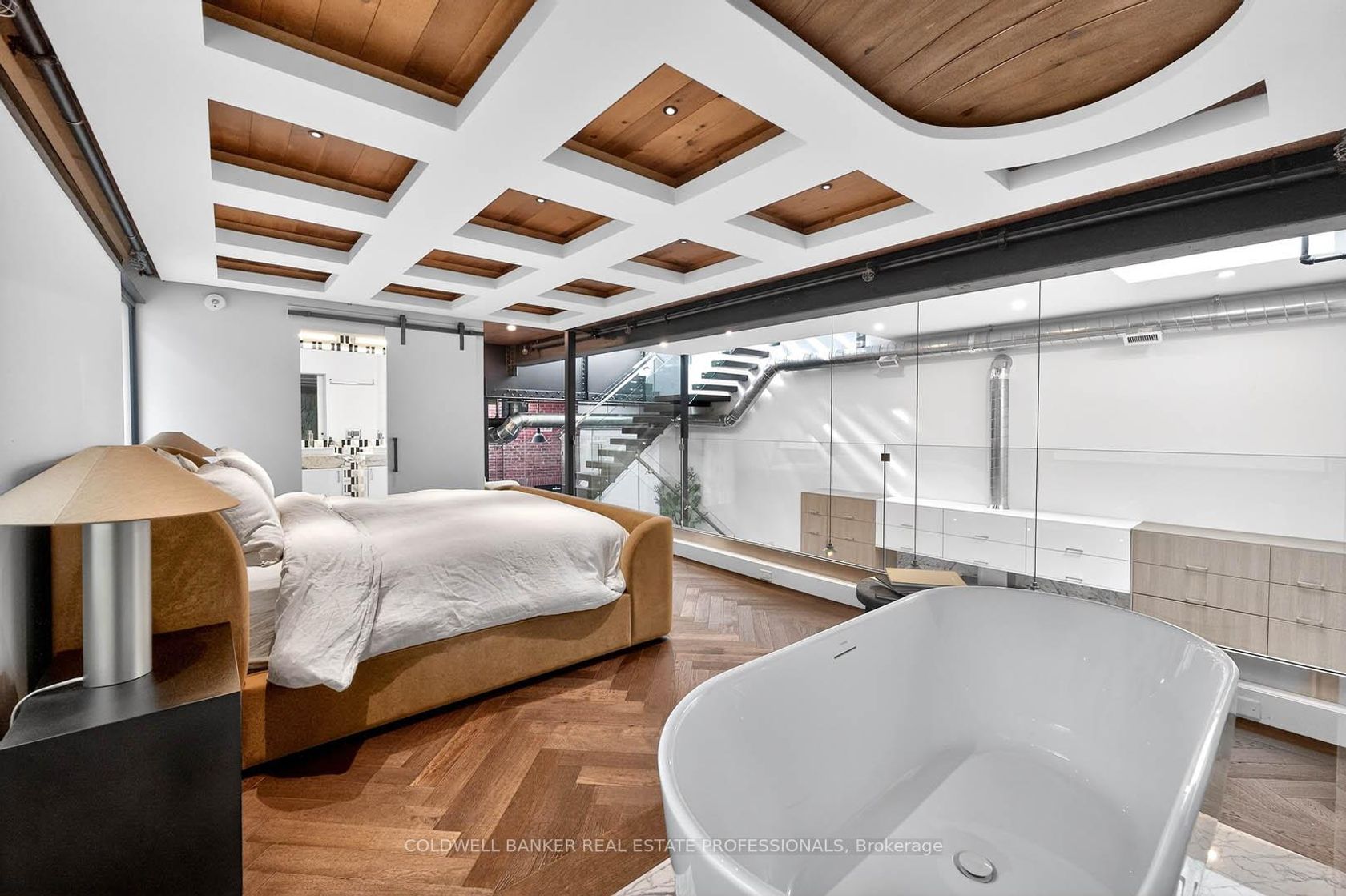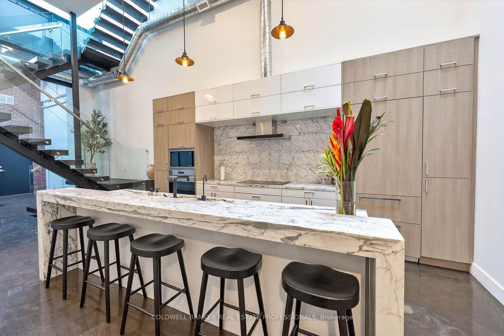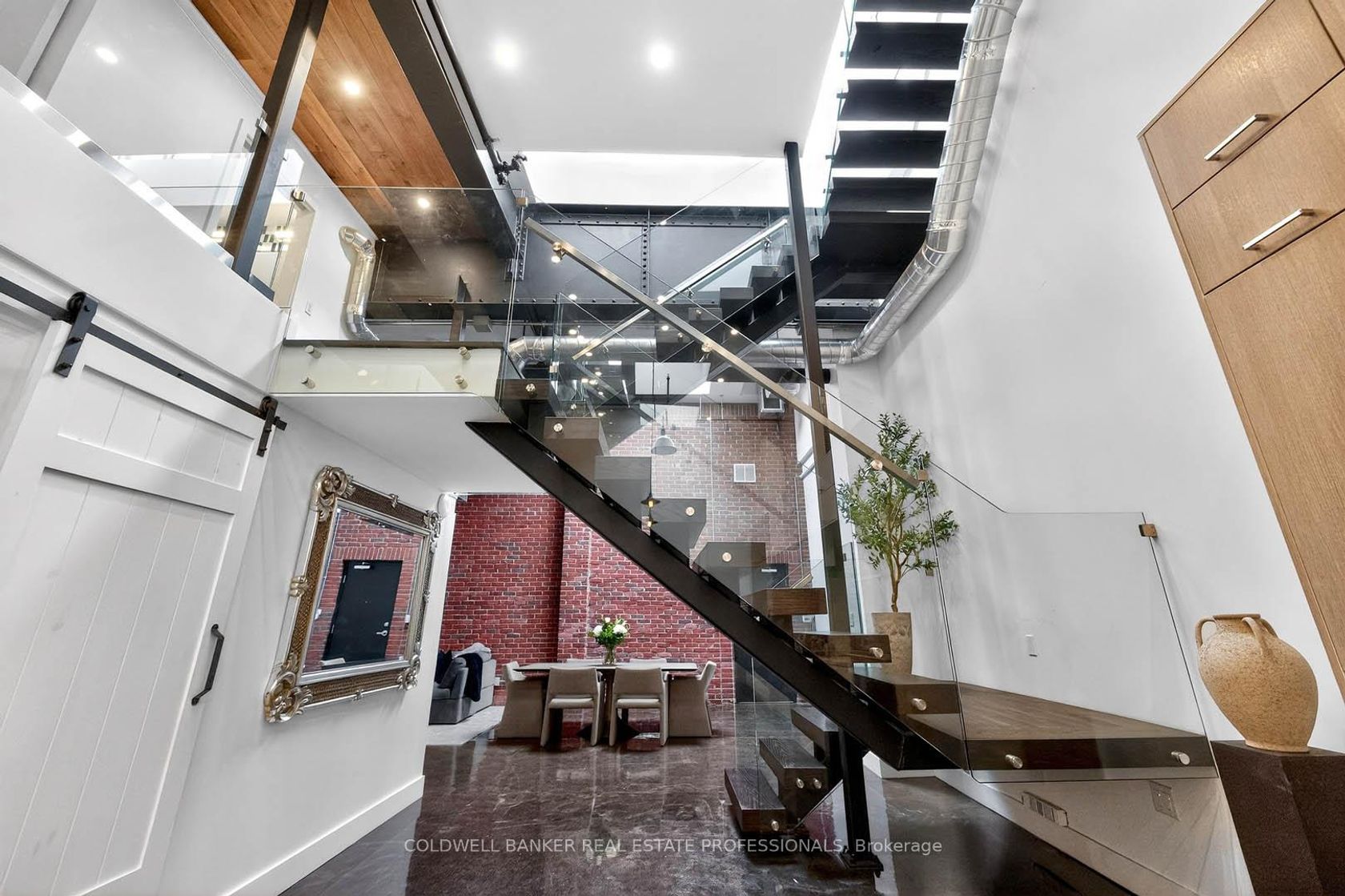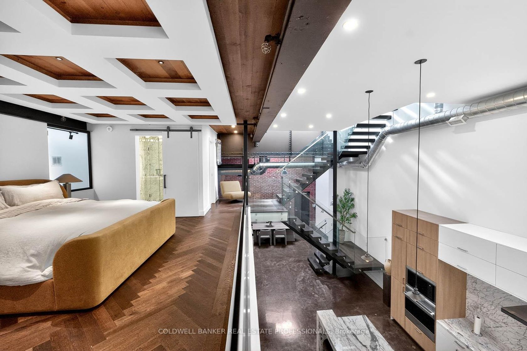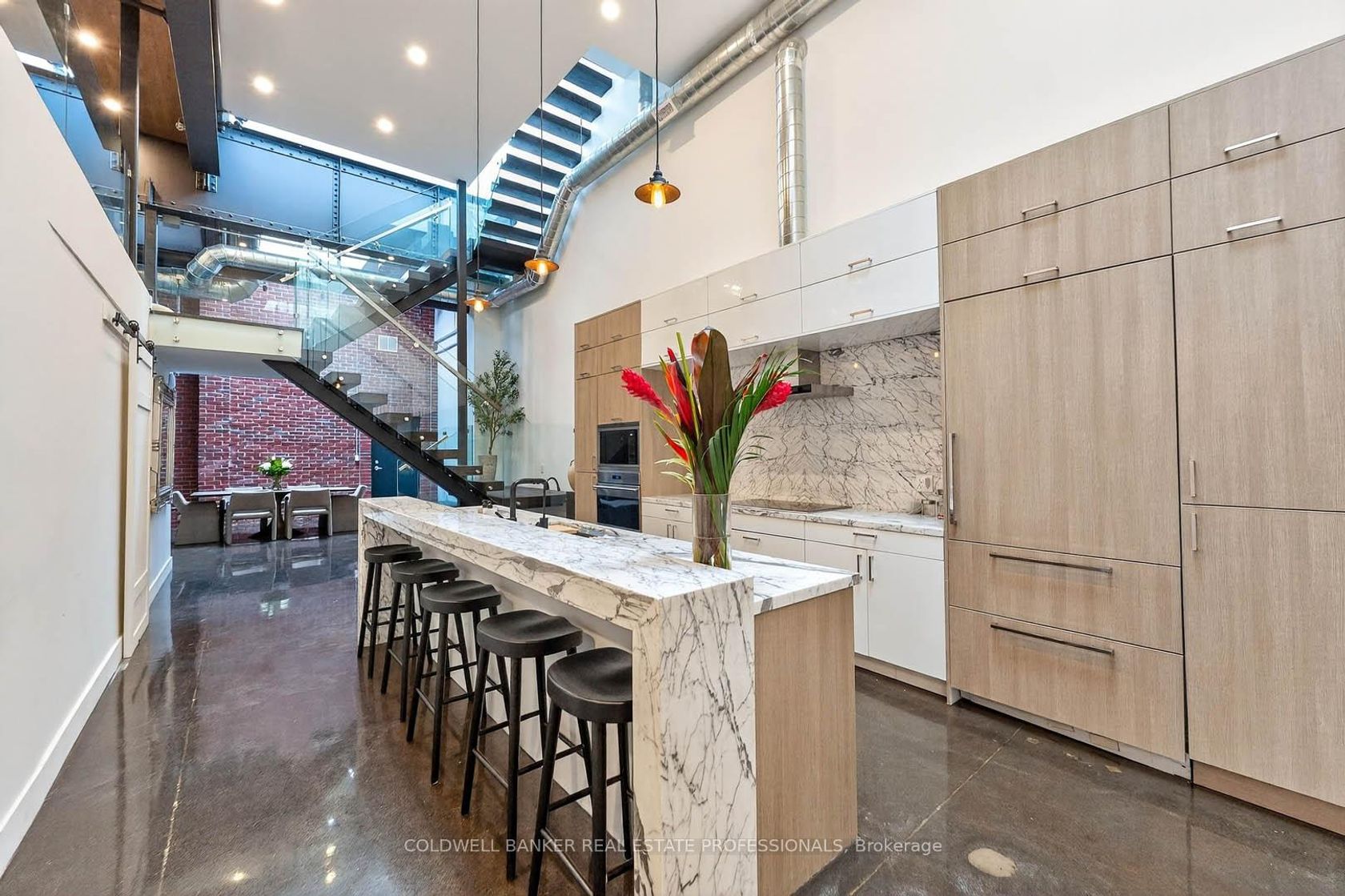 An Architectural Hard Loft Masterpiece. Welcome to The 13 Skylight Loft! A truly spectacular multi-level industrial conversion unlike anything else in Leslieville. This rare residence features soaring 15 and 18 ft ceilings with 13 skylights, including remote operated skylights, flooding the space with natural light and highlighting diamond polished concrete floors and an impressive 18-foot exposed brick feature wall. A dramatic custom floating staircase with solid oak treads and glass railings leads to a striking mezzanine primary retreat overlooking the living space below, creating incredible vertical volume rarely found in Toronto lofts! Complete with herringbone hardwood floors, custom built-ins, and span inspired baths with Kohler fixtures, glass walk-in showers, and a luxurious soaking tub. At the heart of the home, a designer kitchen showcases Italian marble countertops, custom cabinetry and premium appliances including Wolf, Sub-Zero, Miele and a wine fridge anchored by a stunning oversized island. Step outside to your private rooftop terrace with breathtaking Toronto skyline views...the ultimate urban retreat. Additional features include Control4 smart home technology, solid steel mezzanine construction, individual rooftop HVAC, private hot water tank, upgraded designer lighting, double entry, and in-suite laundry. Located in the heart of Leslieville & Riverdale, one of Toronto's most vibrant creative communities. Steps to acclaimed restaurants, cafés, galleries, fitness studios, transit and the future Ontario Line, with quick access to the Gardiner, Lake Shore Blvd, and the DVP. 1 Parking spot included. Extra parking available nearby for rent.