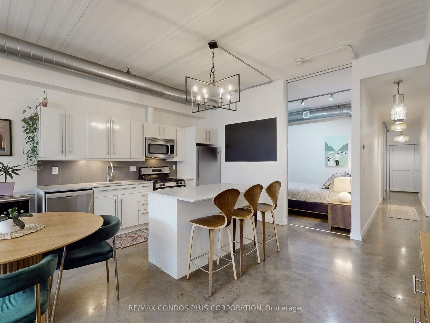Riverside Lofts! Bright and spacious 1-bedroom+den in Toronto's desirable Riverdale neighbourhood. Features 1009 sf of interior living space, functional open concept layout ideal for entertaining, & generously sized primary bedroom with huge closet and 4-pc ensuite. Large den perfect for a home office, media room, or 2nd bedroom. Beautifully finished interior with polished concrete floors throughout, soaring 10 ft ceilings, exposed ductwork, & floor-to-ceiling windows. Well-appointed kitchen includes stylish high gloss cabinets, ample storage, quartz counters, stainless steel appliances, undermount lighting, and large centre island. Massive 135 sf terrace with BBQ gas line. Steps to the public transit, Jimmie Simpson Park, and countless restaurants, cafes, shops, and boutiques along Queen St. E. Minutes to the Toronto Waterfront, Tommy Thompson Park, Woodbine Beach, and Martin Goodman Trail.