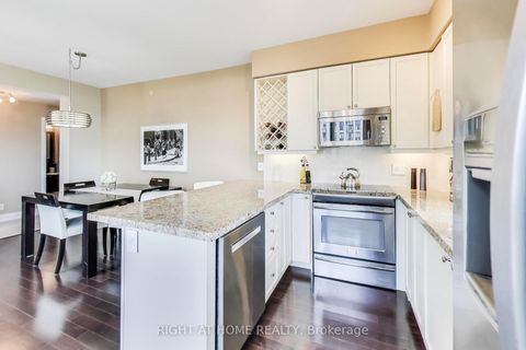 Many Builder Upgrade$ + 2 parking (rent a spot or sell it). This upgraded 2-Bed Corner suite has a Stunning Kitchen! The unit includes 1 locker, a linen/storage closet, in-suite laundry, and many upgrades. The lighting and the light switches have been upgraded to Legrand plus, high-end stainless steel appliances including a fridge with water dispenser, counter-depth stove, a spotless oven, Bosch dishwasher, and microwave. The modern kitchen is enhanced with granite countert…ops, a breakfast island, undermount sink with upgraded faucet, extended cabinetry with a built-in wine rack, and valence lighting. Additional features include a TV bracket, custom zebra blinds in every room... all included