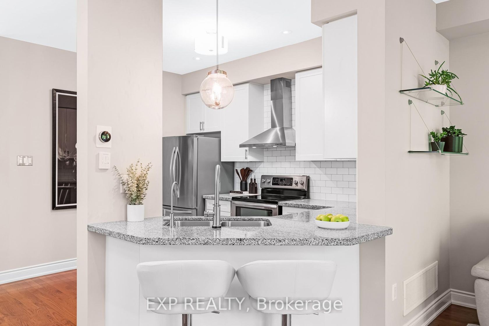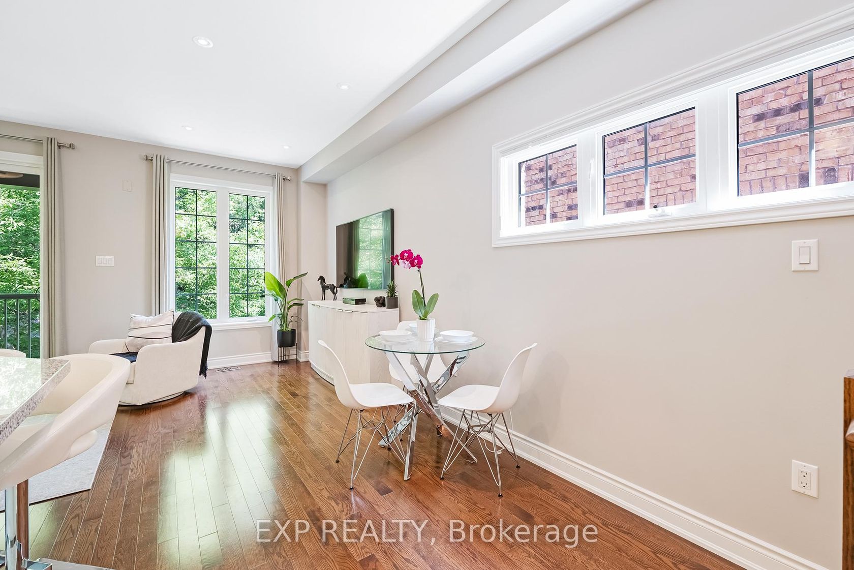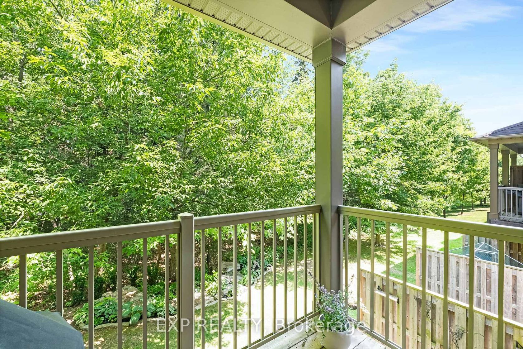 Discover a rare blend of size, privacy, and elegance in this impeccably maintained executive end-unit townhome by Daniels.Tucked within a quiet enclave of the prestigious Stonehaven neighbourhood, this residence offers a serene retreat backing onto protected forest. Nearly 2,000 sq. ft. of finished living space across three levels features smooth 9-ft ceilings and rich hardwood floors throughout, creating a warm, open feel.The gourmet kitchen shines with stainless steel appli…ances, granite counters, and a large centre island with breakfast bar-ideal for entertaining. Step from the living area onto your private covered balcony to enjoy stunning four-season forest views.Upstairs, the luxurious primary suite features a custom walk-in closet and 4-piece ensuite with marble counter and deep soaker tub. The professionally finished walk-out basement extends your living space with a family/fitness area, full bath, and renovated laundry room with built-ins. Sliding doors open to a private patio and landscaped yard, blending indoor and outdoor living.Upgrades include: custom closets, quartz vanities, new antimicrobial cork-underlay flooring (2024), freshly painted interiors (June 2025), gas BBQ hookup, upgraded lighting, decor vents, interlock brick walkway and patio, and a unique rock garden exclusive to this unit.Enjoy low-maintenance living with modest condo fees, direct garage access, and proximity to St. Andrews Valley Golf Club. This exceptional home combines modern comfort with natural tranquility-an absolute must-see.