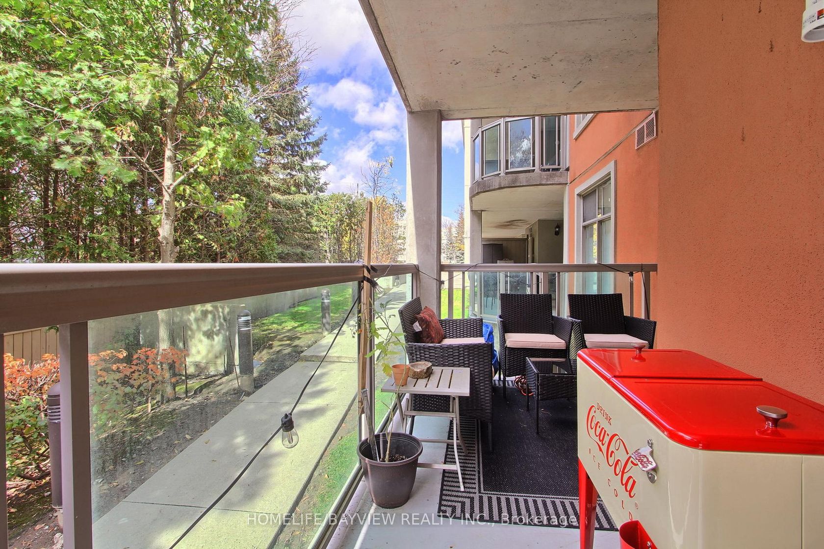 Rarely Available Low Rise Boutique Condo In The Heart Of Woodbridge. Meticulously Maintained. 1 Bedroom + Den; Open-Concept Layout; Kitchen Redone in 2024 with Brand New S/S Appliances (2024) & Granite Countertops w/Breakfast Bar; New Bathroom With Glass Shower Enclosure (2021), Walkout To Huge Terrace (155 Sq. Ft); Upgraded 7" Baseboards & Crown Molding Throughout; New AC/Heat/Gas Unit (2025), Natural Gas Line for BBQ, Huge Locker And 1 Parking Spot. Majestic Ravine Setting …On The Humber River. Minutes To Market Lane & Highways; Steps To Transit & Schools. Amenities Include Gym And Party Room. **Low Maint Fees**