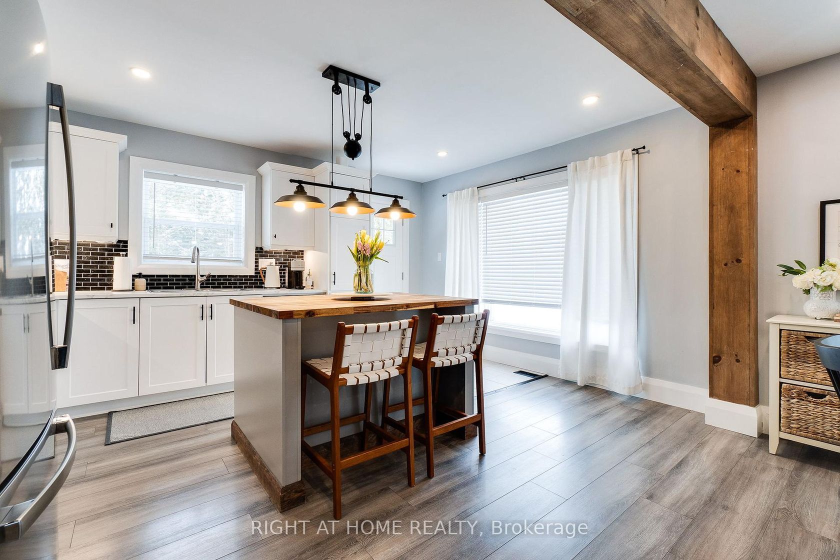 Beautiful, bright, and open 3-bedroom, 2-bathroom bungalow, tastefully updated and full of charm, just steps from the stunning shores of Lake Simcoe. A new farmhouse-style front door welcomes you into a wonderful open-concept layout ideal for entertaining, front foyer is complete with heated floor for your comfort. The cozy living room features an electric fireplace with a wood beam mantel, adding warmth and character, while stunning structural exposed beams further enhance t…he home's inviting atmosphere. The dining room is filled with natural light from a large bay window, and the renovated kitchen is complete with modern white cabinetry, a large island with butcher block top, and abundant cabinet space. The spacious primary bedroom offers semi-ensuite access featuring heated floors and a large glass walk-in shower. Two additional large, spacious bedrooms provide comfort and flexibility, complemented by a beautifully renovated main bathroom with a soaker tub and heated floors. Additional highlights include a huge laundry room with a large utility closet, the peace of mind of a new sump pump and well water UV light, plus a detached insolated garage-perfect for a workshop or additional workspace. Situated on a large, private lot with lovely front and backyard landscaping, this outdoor space includes a patio, vegetable garden, and cozy firepit, making it perfect for summer nights. Walk to Royal Beach for swimming, boating, fishing, and snowmobiling, this property offers year-round enjoyment in a fantastic lakeside setting. Water Heater owned