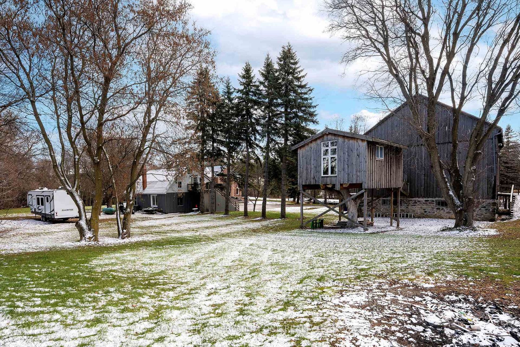 Century farmhouse charm meets modern luxury - enter through a private, winding tree-lined driveway loading to this breathtaking 12-acre property of rolling hills and tranquil ponds, minutes from Highways 400 and 27 in prestigious King Township. Offering over 7,000 sqft of finished living space, this fully renovated home was taken to the studs and rebuilt with exceptional craftsmanship. Soaring ceilings and expansive windows frame picturesque views, while the open-concept layout delivers bright, functional living without compromising comfort. The chef's kitchen showcases premium Thermador appliances, custom cabinetry by Povey Custom Woodworking, and a large island made for gathering. Thoughtfully upgraded throughout with imported European tile, designer finishes, new plumbing, electrical, HVAC, geothermal-ready systems, and solar power income for added efficiency and value. Leathered granite fireplaces, smart lighting, high-end fixtures, and a restored sauna elevate the experience. Outdoors, enjoy a new covered deck and professionally landscaped grounds. A carriage house offers parking for 3+ vehicles with a private 2-bedroom apartment above, complemented by an original 1800s barn. A separate home office with bedroom and ensuite ideal as an in-law or nanny suite includes additional lower-level walkout space. Crafted by award-winning Gatti Brother Renovations, this is more than a renovation it's a legacy home, reimagined. See attached full list of renos and features. A carriage house includes second floor living quarters. Private trails lead to the meandering Schomberg Creek and across a charming bridge to a serene pond - perfect for summer swims or winter hockey games. This is a property for those in search of something truly special.