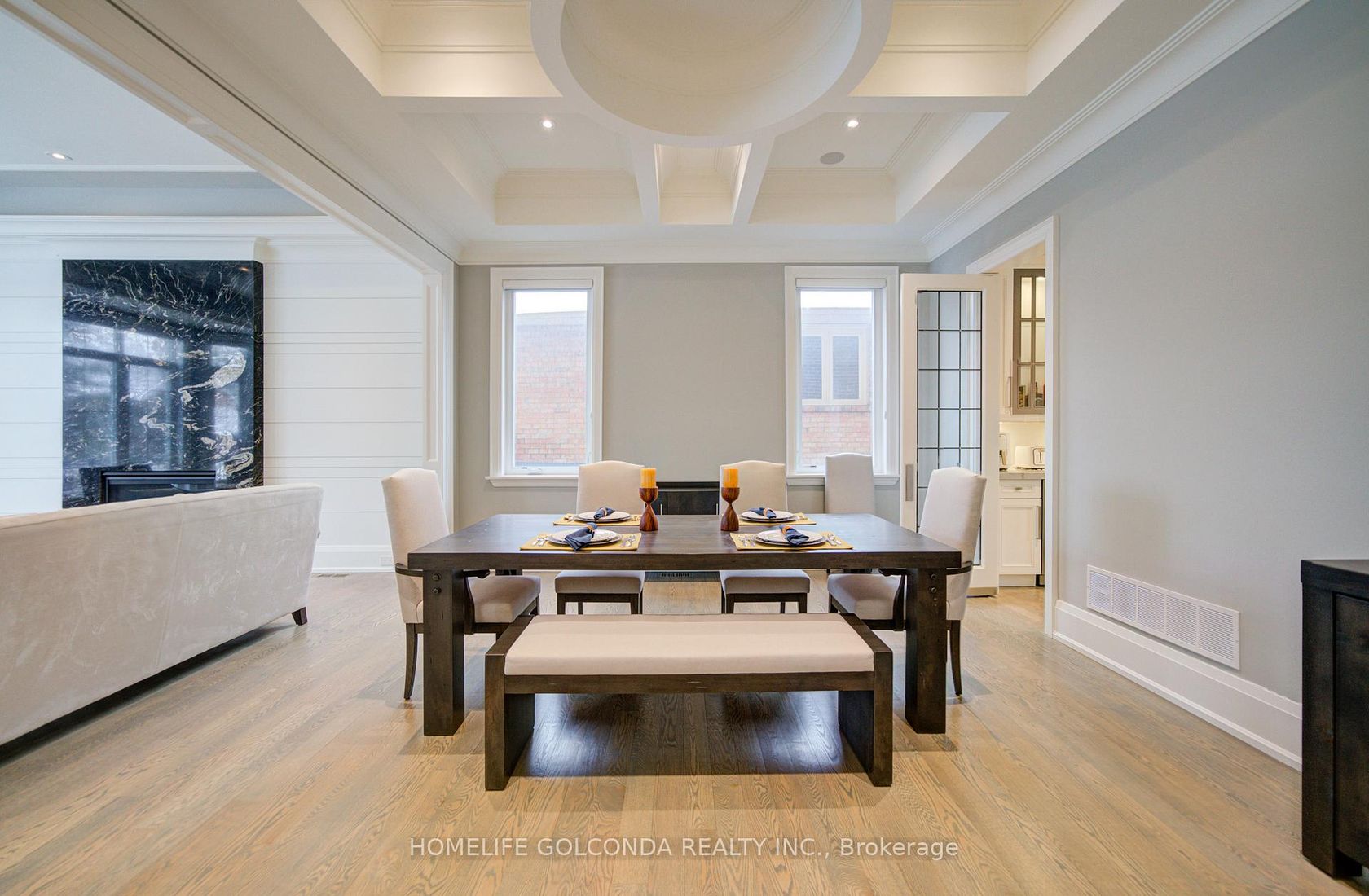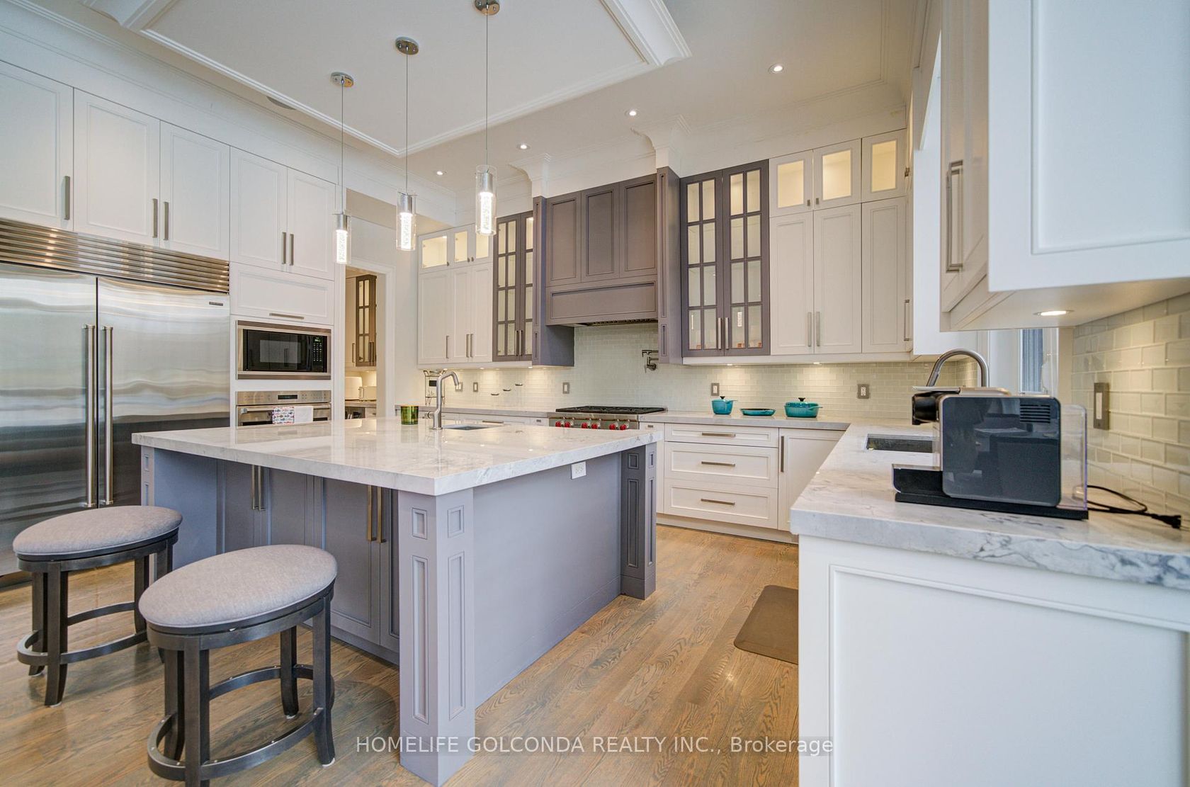 An exquisite custom-built estate showcasing outstanding craftsmanship and meticulous attention to detail, ideally situated in the prestigious South Richvale community. Offering over 6,000 sq. ft. of luxurious finished living space, this exceptional residence is designed with premium materials, refined architectural elements, and superior quality throughout.The striking limestone exterior and luxury windows create a grand first impression, while the thoughtfully designed inter…ior features 11-foot ceilings on the main floor, 10-foot ceilings on the second level, and 9-foot ceilings in the professionally finished basement. Elegant marble and rich hardwood flooring extend across both levels, complemented by an impressive oversized skylight that fills the home with natural light. A private elevator provides seamless access to all floors, while numerous LED pot lights and a fully integrated sound system with built-in speakers enhance both ambiance and functionality.The gourmet chef's kitchen is beautifully appointed with luxurious stone countertops, high-end finishes, and a separate serving area-perfect for formal entertaining and family gatherings. Four fireplaces throughout the home add warmth, comfort, and architectural sophistication.The walk-up basement offers exceptional additional living space, featuring heated floors, a spacious recreation room with fireplace, a wet bar, and one bedroom with a full bathroom-ideal for extended family, guests, or entertaining. Additional features include a comprehensive security system with cameras, central vacuum, and an automatic irrigation system for effortless maintenance.A rare opportunity to own a distinguished luxury residence in one of the most sought-after neighborhoods, offering elegance, comfort, and modern convenience at every turn.