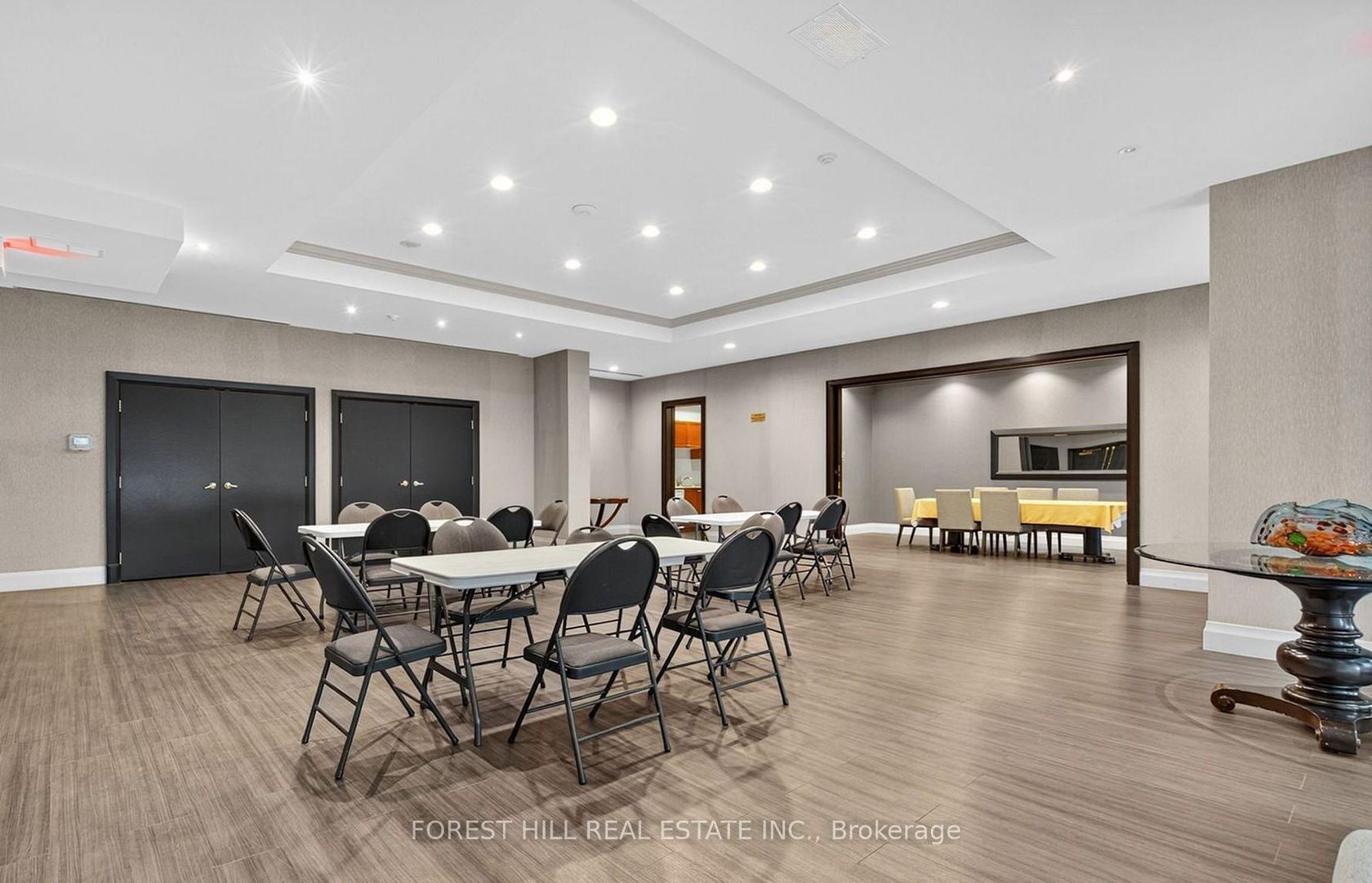 Welcome to this thoughtfully renovated 1,300 sq. ft. corner suite offering the perfect blend of style, space, and functionality. This bright 2-bedroom + office (easily a 3rd bedroom), 2-bathroom split-bedroom layout is flooded with natural light and features a private balcony for relaxing and entertaining. Step inside to beautiful hardwood floors and a stunning, custom-designed chef's kitchen complete with stainless steel appliances, granite countertops that seamlessly flow into the backsplash and waterfall edge, 24" porcelain tile, deep pantry, breakfast bar, and sleek pot lighting. The open-concept design connects effortlessly to the breakfast area and dining space, highlighted by elegant built-in cabinetry, crown moulding, pots lights and additional custom storage throughout the home. The spacious primary bedroom easily accommodates a king-size bed with room to spare, featuring two closets, including a walk-in. The luxurious ensuite offers double sinks and a large glass-enclosed walk-in shower. The second bedroom is thoughtfully designed with 2 Twin Murphy beds and wall-to-wall built-ins, maximizing both comfort and versatility. This redesigned suite also includes a dedicated laundry space with full size laundry tub, central vacuum system, and exceptional attention to detail throughout.Perfectly suited for those downsizing from a house, starting a family, or just seeking space and comfort, this exceptional suite offers both practicality and elegance. Enjoy unbeatable amenities including an indoor pool, hot tub & sauna, exercise, media and movie theatre rooms. All convenience just steps away including Promenade Mall, transit, restaurants, cafes, grocery stores, medical services & Walmart, Pickleplex, Bowling, library. For your added value, the maintenance fees include internet and cable. A truly exceptional home offering comfort, craftsmanship, and location-perfect for modern living.