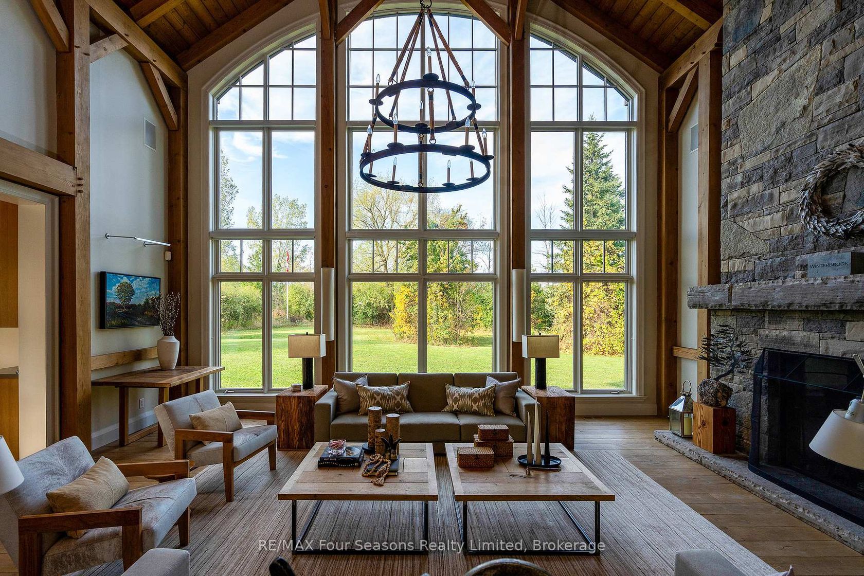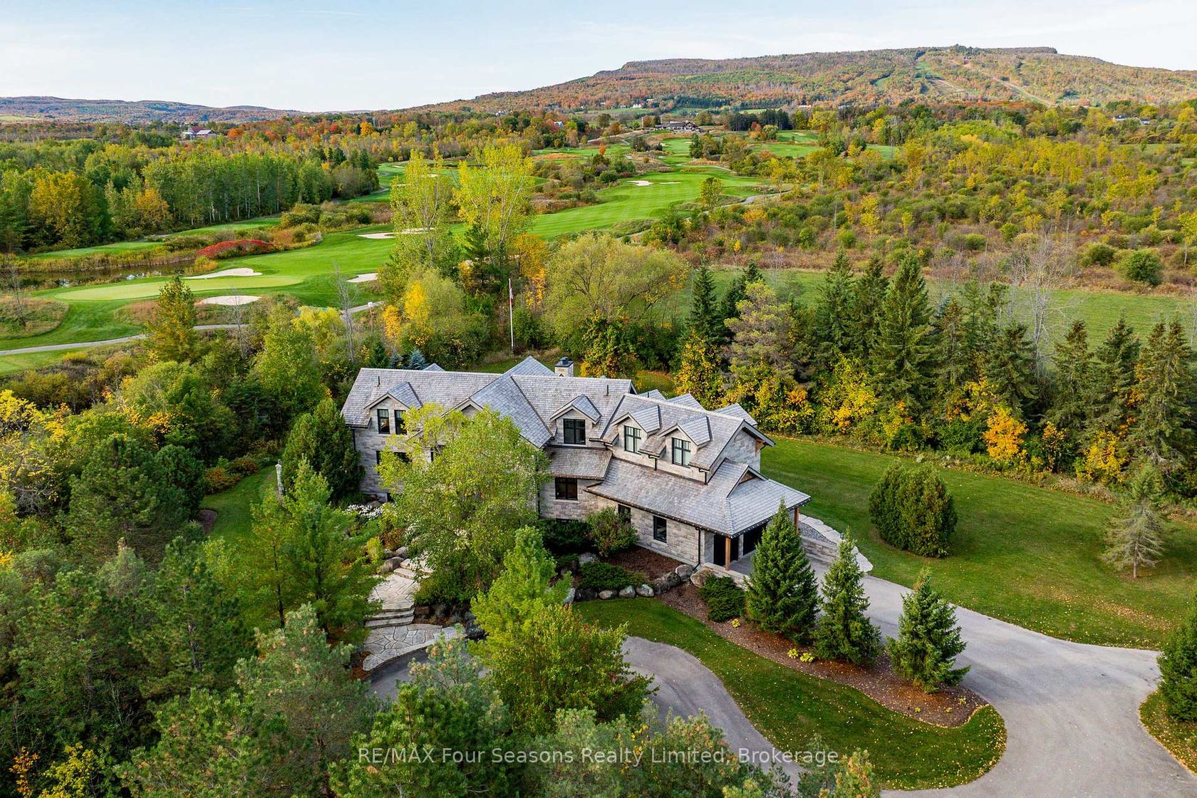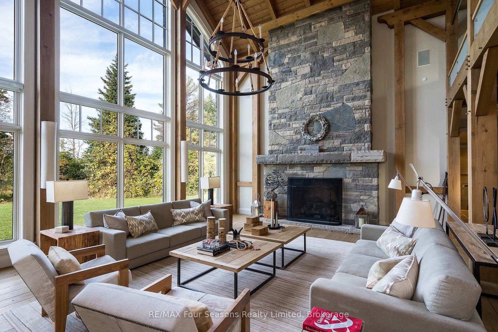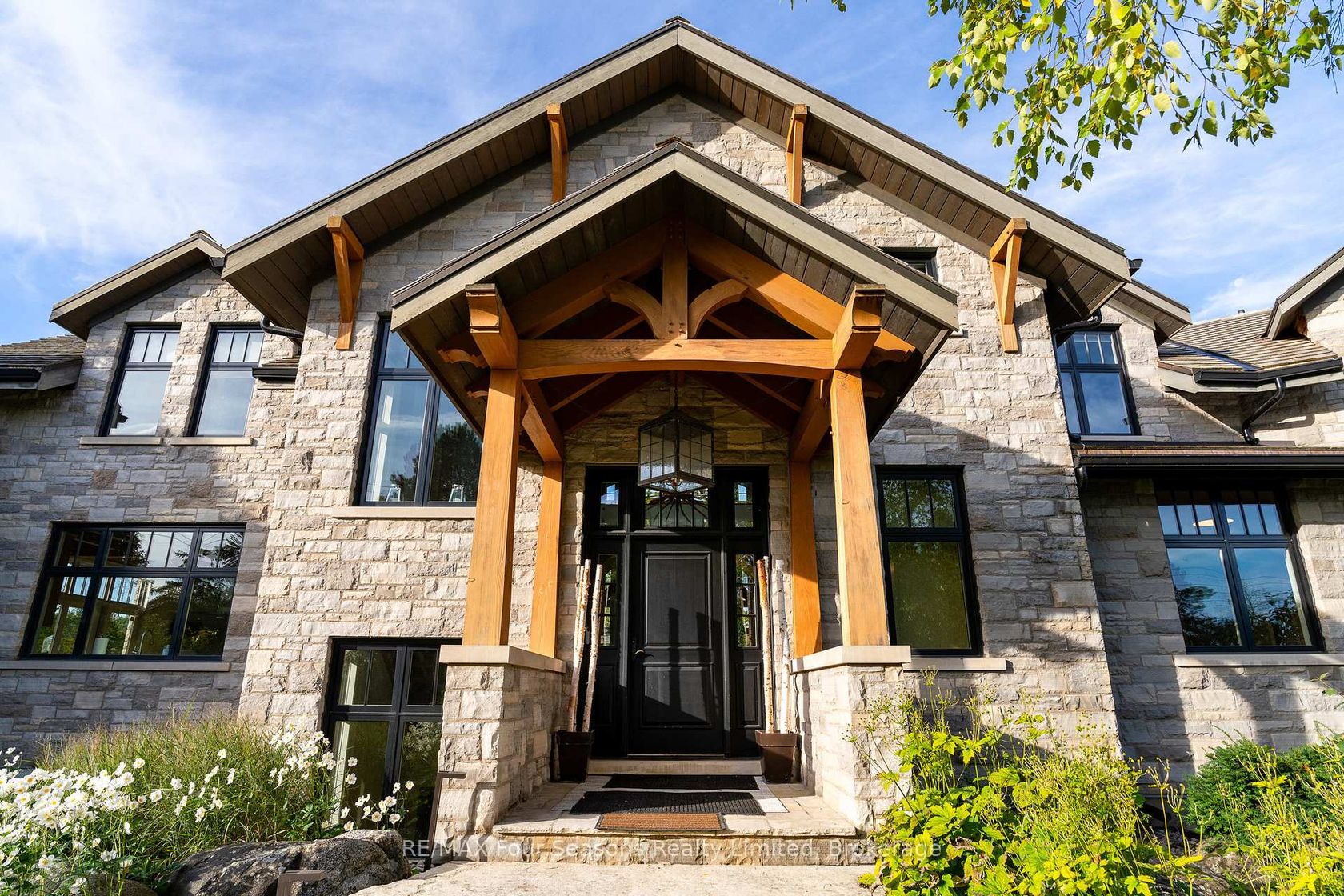 Introducing Winterbrook, a luxurious custom estate home masterfully crafted by Dalton Beachli. Nestled on just under two acres of beautifully landscaped grounds, this extraordinary residence is surrounded by panoramic views of the escarpment, Osler Brook Golf Course, and Osler Bluff Ski Club, and backs onto 98 acres of peaceful forest/farmland. Being offered fully furnished, this home is both a refined gathering place and a serene private retreat, perfectly balancing sophisti…cation, comfort, and connection to nature. Encompassing 5,321 square feet of exquisitely finished living space, Winterbrook features six bedrooms, five bathrooms, and a curated selection of high-end finishes and upgrades. The main level showcases imported Belgian quarter-sawn white oak floors, while the kitchen is enhanced with reclaimed Belgian limestone and high end appliances. At the heart of the home, an Eramosa stone fireplace from Owen Sound creates a striking focal point anchoring the open-concept living space with timeless natural beauty, along with the 26-foot ceilings and floor-to-ceiling windows that capture sweeping views from every angle. Designed equally for entertaining and unwinding, the home offers a commercial-grade gym, three fireplaces, and a custom mudroom to complement an active, four-season lifestyle. Outside, a spectacular outdoor oasis extends the living space across the full width of the home. Enjoy dining, lounging, and hot-tub areas that invite relaxation and connection. Begin your day with sunrises over the terrace, and end with evenings by the fire pit, as cotton candy skies fade into starlit nights. Whether hosting a summer soiree or an intimate winter gathering, every moment here is framed by natural beauty. Ideally located just minutes from Osler Bluff Ski Club, Blue Mountain, and downtown Collingwood, Winterbrook is a true four-season paradise and is a celebration of craftsmanship, design, and modern luxury that defines extraordinary living.