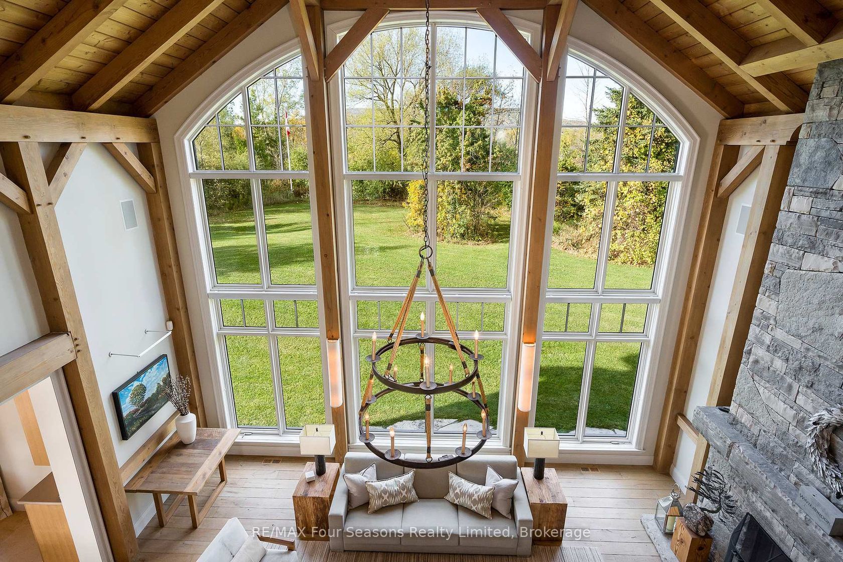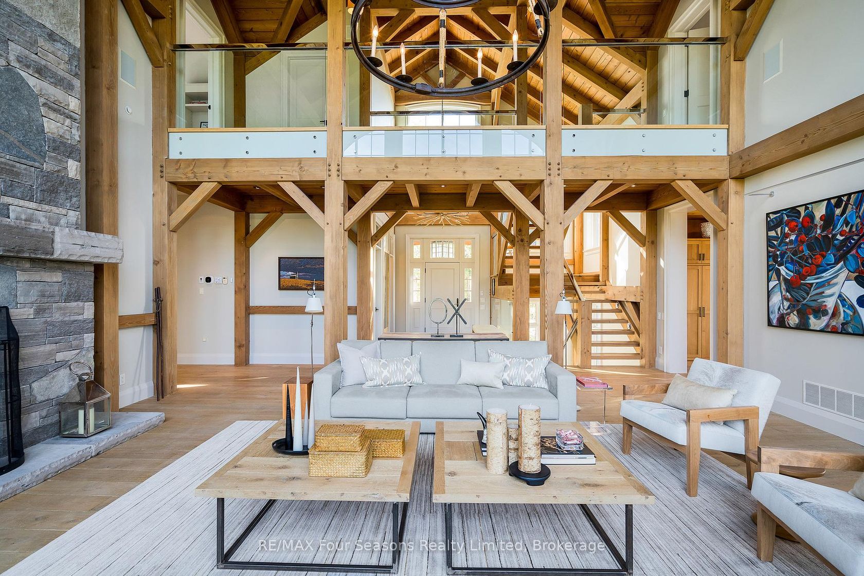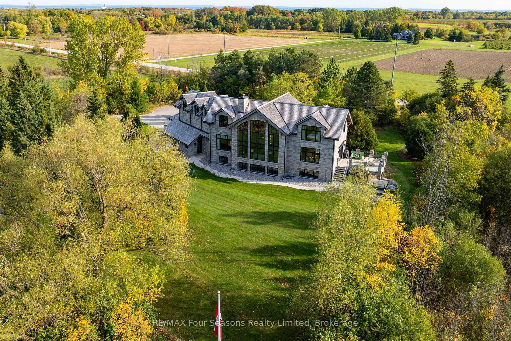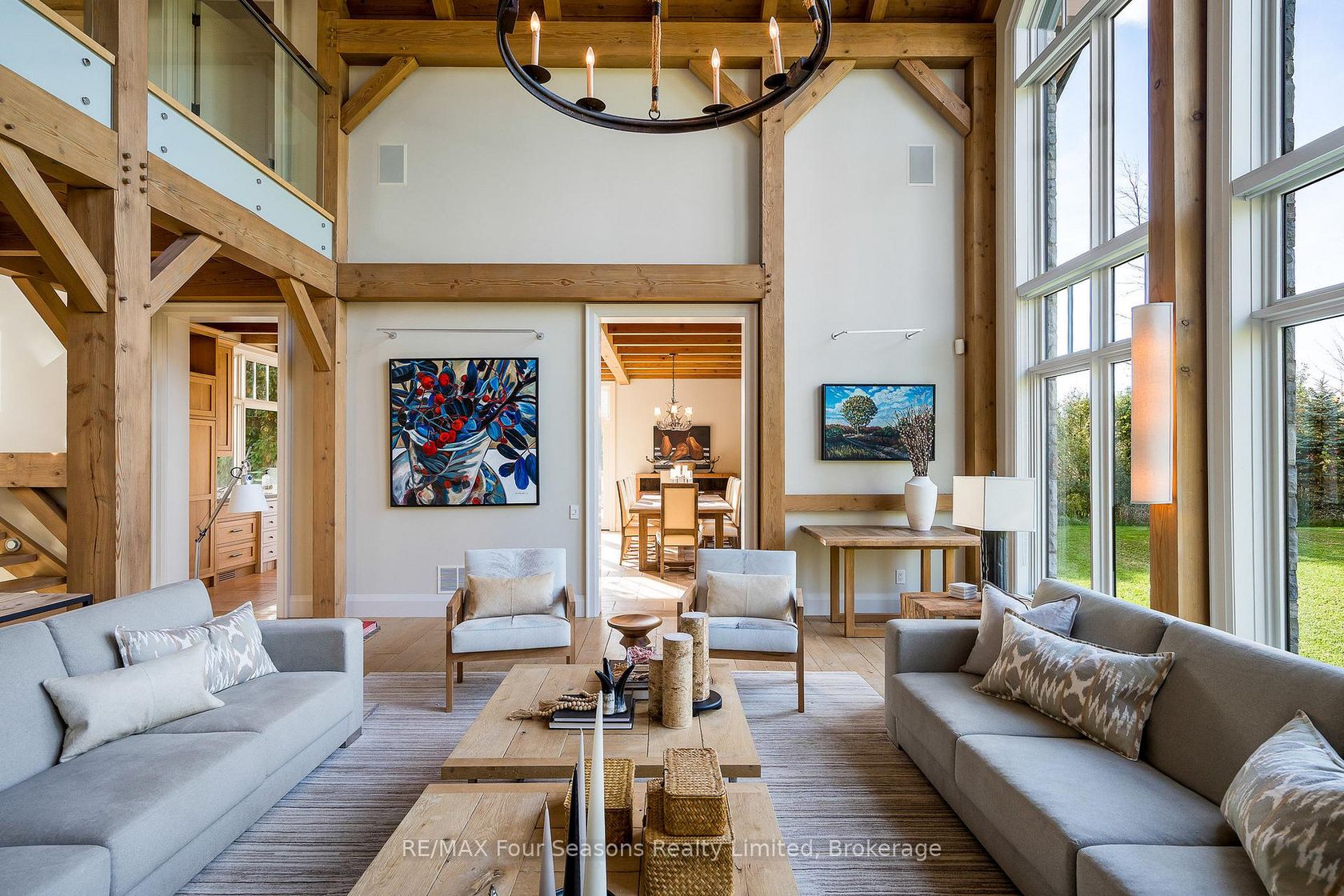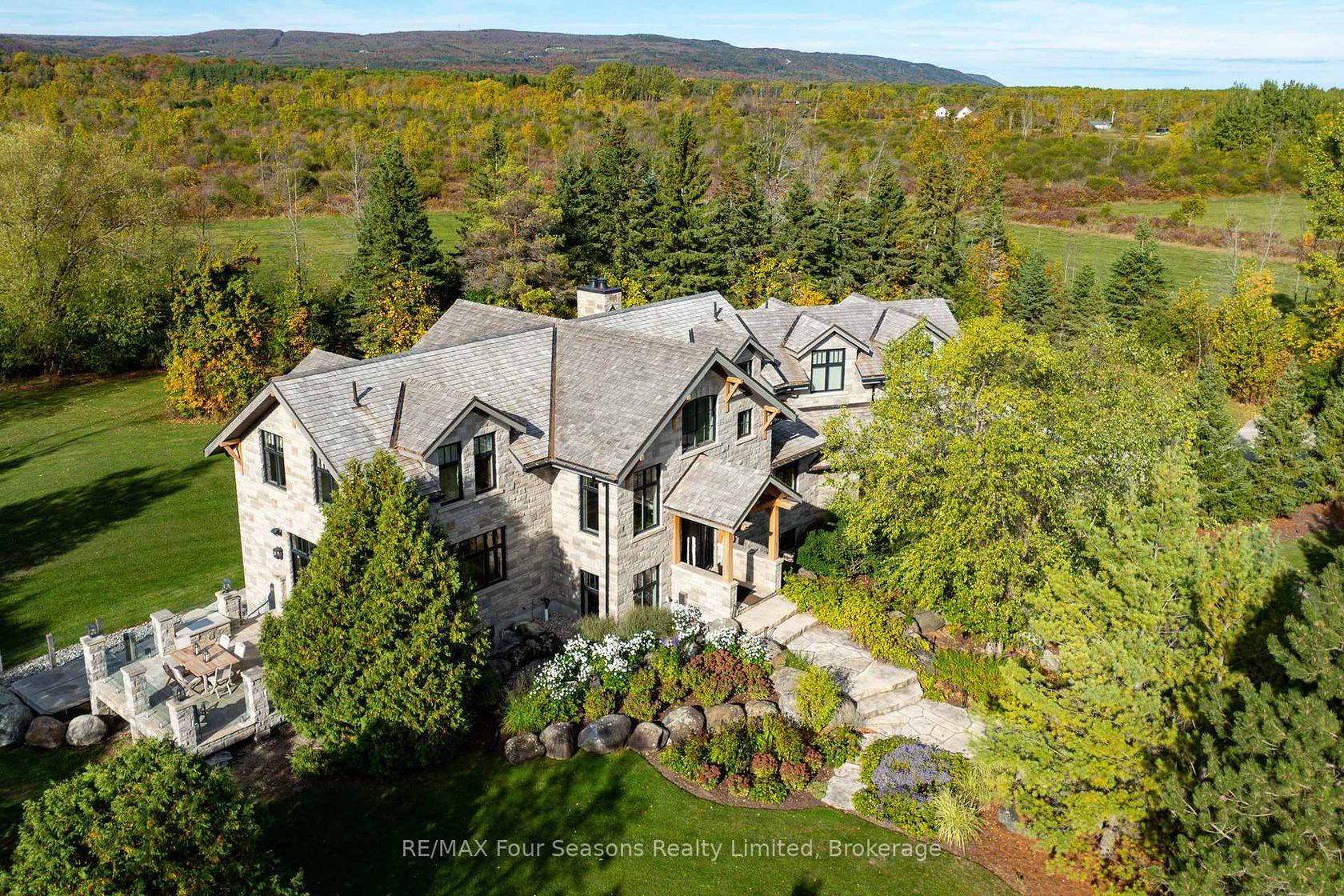 Introducing Winterbrook, a luxurious custom estate home masterfully crafted by Dalton Beachli. Nestled on just under two acres of beautifully landscaped grounds, this extraordinary residence is surrounded by panoramic views of the escarpment, Osler Brook Golf Course, and Osler Bluff Ski Club, and backs onto 98 acres of peaceful forest/farmland. Being offered fully furnished, this home is both a refined gathering place and a serene private retreat, perfectly balancing sophisti…cation, comfort, and connection to nature. Encompassing 5,321 square feet of exquisitely finished living space, Winterbrook features six bedrooms, five bathrooms, and a curated selection of high-end finishes and upgrades. The main level showcases imported Belgian quarter-sawn white oak floors, while the kitchen is enhanced with reclaimed Belgian limestone and high end appliances. At the heart of the home, an Eramosa stone fireplace from Owen Sound creates a striking focal point anchoring the open-concept living space with timeless natural beauty, along with the 26-foot ceilings and floor-to-ceiling windows that capture sweeping views from every angle. Designed equally for entertaining and unwinding, the home offers a commercial-grade gym, three fireplaces, and a custom mudroom to complement an active, four-season lifestyle. Outside, a spectacular outdoor oasis extends the living space across the full width of the home. Enjoy dining, lounging, and hot-tub areas that invite relaxation and connection. Begin your day with sunrises over the terrace, and end with evenings by the fire pit, as cotton candy skies fade into starlit nights. Whether hosting a summer soiree or an intimate winter gathering, every moment here is framed by natural beauty. Ideally located just minutes from Osler Bluff Ski Club, Blue Mountain, and downtown Collingwood, Winterbrook is a true four-season paradise and is a celebration of craftsmanship, design, and modern luxury that defines extraordinary living.