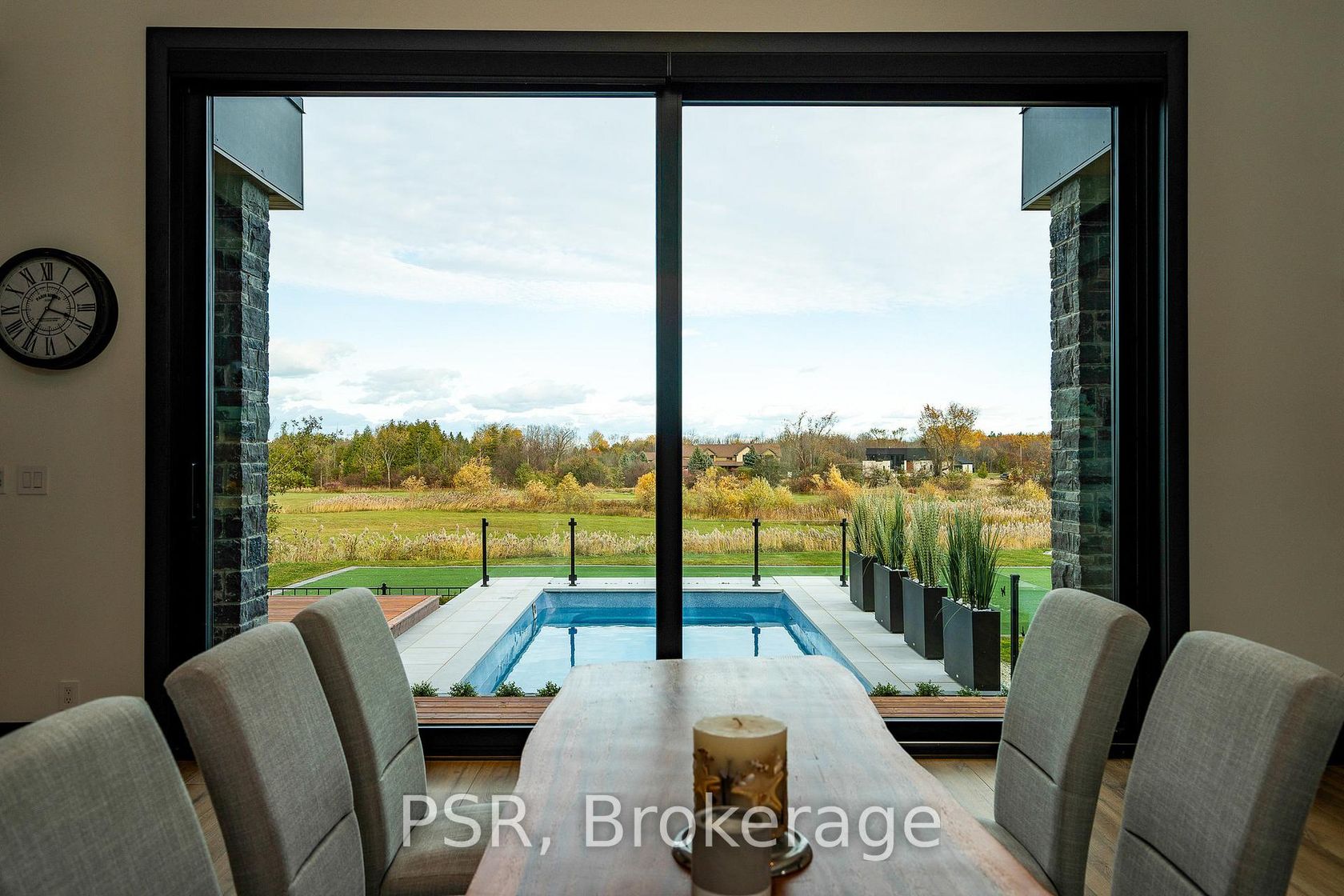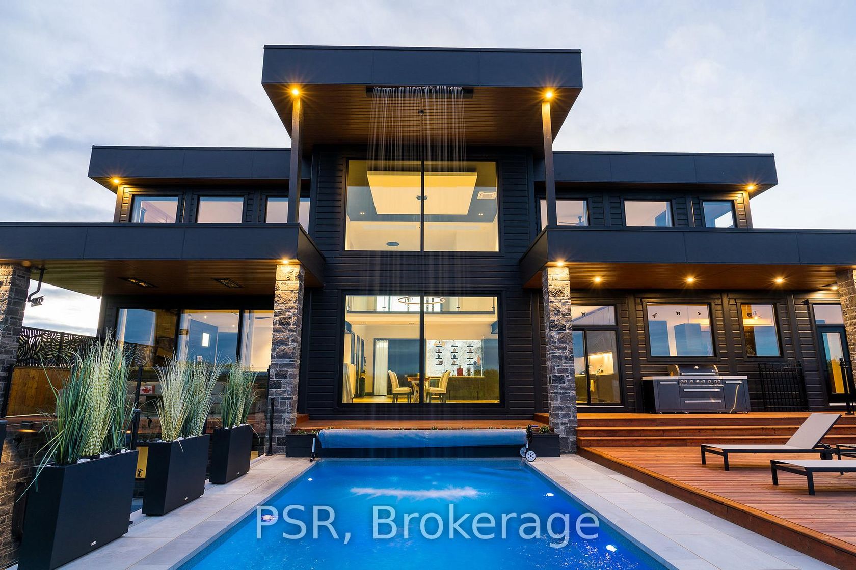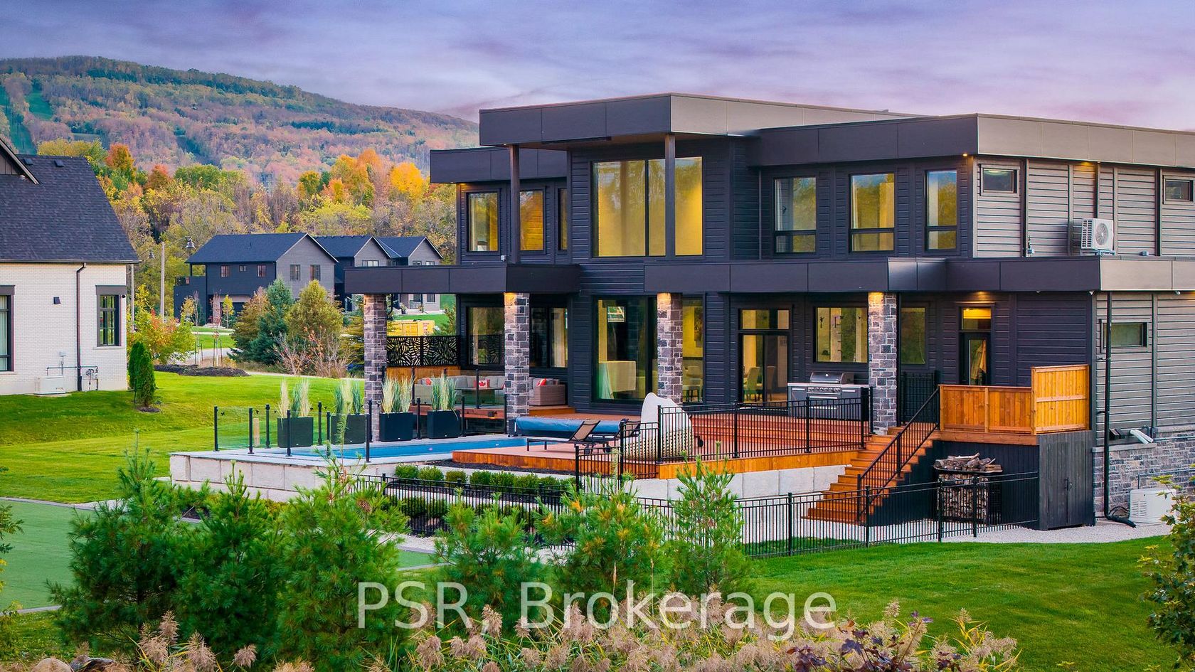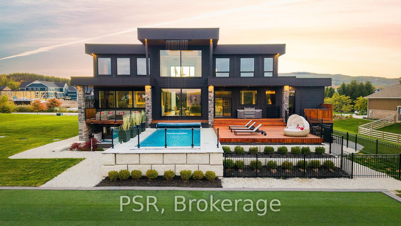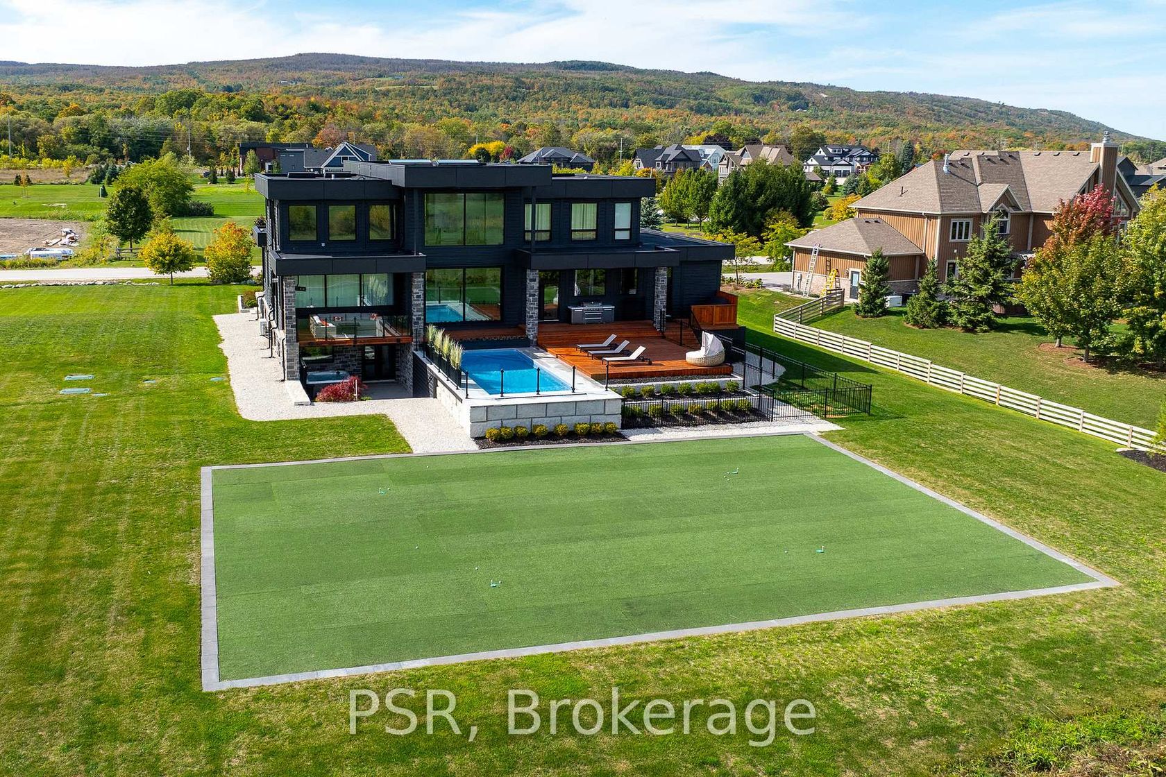 Welcome to the extraordinary turn key living experience offered by 4 Raintree Court, nestled in the heart of Ontario's ski country. This luxurious home in the exclusive Windrose Estates combines elegance and sophistication with functional amenities for today's modern families. This custom-built home offers five spacious bedrooms, seven bathrooms, a home theatre, fully equipped gym, sauna, hot tub and heated pool over 8,600 square feet of interior space on a one-acre lot. High… ceilings, custom lighting design, multiple skylights and walls of windows work with the wood accent walls to create a contemporary space that is flooded with light. In-floor radiant heating keeps the space cozy and warm throughout ski season as you sit by the fireplace watching the snow fall. The grand kitchen and dining area serve as the heart of this home, with soaring 23ft ceilings and the 10ft high by 16 ft wide sliding doors overlooking the backyard and 10-acre parkland beyond. Equipped with top-of-the-line appliances and designer counters and finishes, the kitchen is a perfect space for those who love to cook and entertain. The outdoor entertainment area includes a new outdoor kitchen, conversation area featuring patio heaters, heated pool and a waterfall that cascades from the upper roof into the pool. The property offers stunning mountain views of Osler Bluffs and Blue Mountain which can be enjoyed from throughout the home. Both resorts are less than ten minutes from the estate, as is downtown Collingwood. Simcoe County is known for its vibrant community atmosphere and natural beauty. From hiking trails to farmers' markets and local festivals-there's always something to see or do here. Notably, Clearview Township allows you to snowmobile or side by side directly out of your own property to the trails located right in the neighbourhood. 4 Raintree Court is more than just a house-it's a lifestyle destination that combines stylish luxury living within your own personal sanctuary.