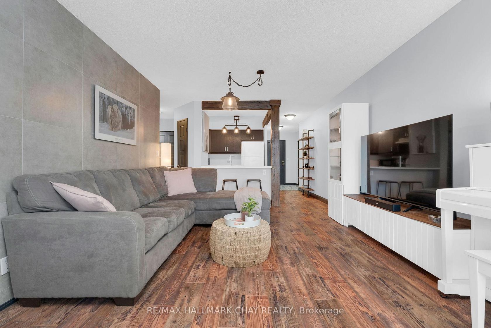 Welcome to Suite 1003 at Bayshore Landing, where waterfront living meets vibrant downtown convenience. This beautifully updated 1-bedroom and den condo offers breathtaking, unobstructed views of Kempenfelt Bay and the Barrie skyline, creating a stunning backdrop in the afternoon sun and for unforgettable sunsets. The thoughtfully designed interior features warm hardwood flooring, complemented by a striking wood beam accent that adds character and charm throughout the main living space. The open-concept layout is enhanced by custom feature walls, including a modern tile design in the living room and a stylish exposed brick wall in the bedroom, giving the home a unique, upscale feel. Large windows flood the space with natural light while perfectly framing the premium lake and city views. The added convenience of in-suite laundry makes everyday living effortless. The versatile den space features a charming Juliet balcony and offers flexibility with access from both the living area and the bedroom. This adaptable space is perfect for a large walk-in closet, additional living area, or the ideal home office for today's remote or hybrid lifestyle. Step outside and enjoy one of Barrie's most sought-after locations. Walk along the North Shore Trail, relax at nearby beaches, or explore the many local restaurants, cafés, and shops just steps from your door. Whether you enjoy an active lifestyle or quiet waterfront evenings, this location truly has it all. Residents of Bayshore Landing enjoy exceptional amenities including an indoor pool, hot tub, sauna, fitness centre, and secure indoor parking. This unit also includes underground parking and a rare, double-sized indoor locker, offering valuable additional storage. Ideal for professionals, downsizers, or anyone looking to embrace a low-maintenance waterfront lifestyle, this is your opportunity to own in one of Barrie's most desirable condo communities.