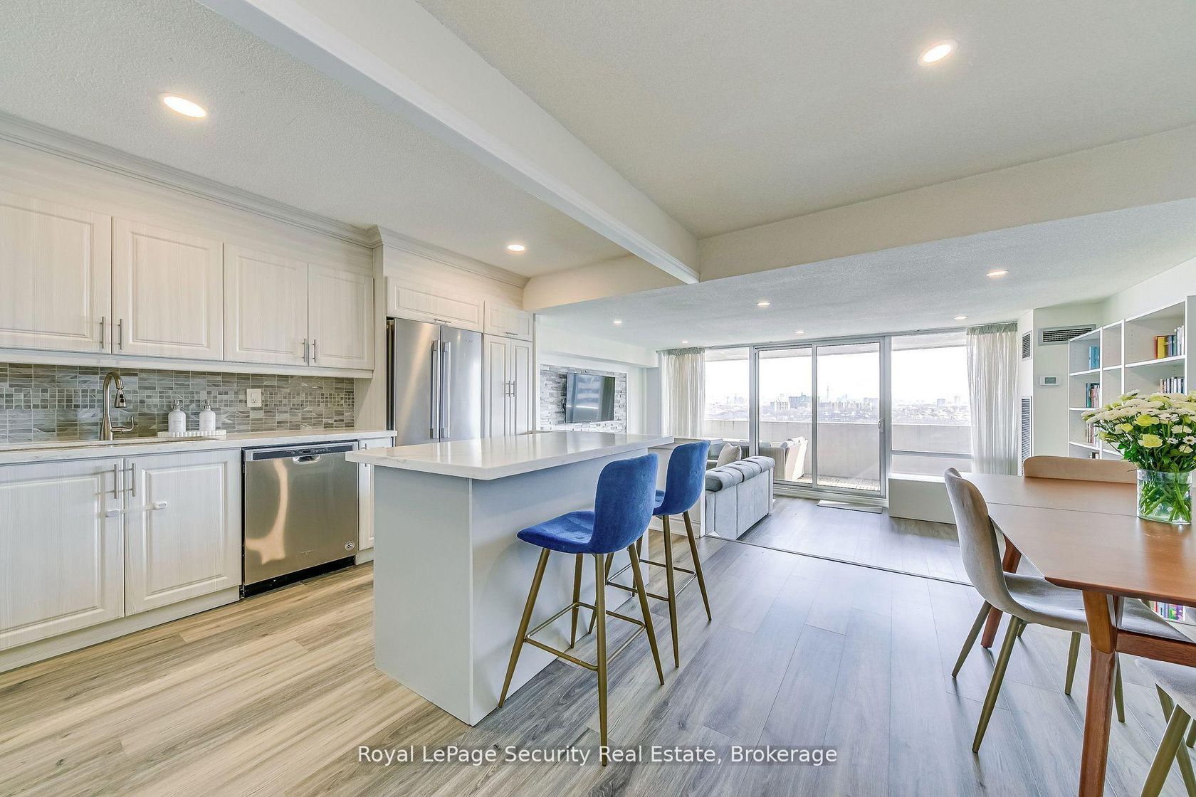 Welcome to the highly sought-after Lambton Square community! This stunning, updated top-floor unit offers a spacious and bright open-concept layout with high-end finishes throughout. 1030sqft living space + 130sqft balcony, total 1160sqft. The modern gourmet kitchen is a chefs dream, featuring ample cupboard space, undermount lighting, a central island with breakfast bar, quartz countertops, stylish backsplash, and stainless steel appliances including a fridge, stove, dishwas…her, microwave rangehood. The spacious sunken living room, combined with the dining area, leads to a large balcony (5.55 x 2.23 meters) with panoramic south east city views and the CN Tower. Enjoy outdoor entertaining with an electric barbeque allowed. This lovely home boasts 2 generously sized bedrooms and 2 updated bathrooms, including a primary bedroom with a large mirrored closet and a 4-piece ensuite. The unit also features a laundry room with a new washer, new dryer, and shelving for added convenience. New flooring, baseboard and fresh professional paint were completed in November 2024. Included with the property is 1 parking space & 1 locker. The building has been elegantly renovated, with updated hallways and lobby. Residents enjoy access to excellent amenities such as an outdoor pool, party room, gym, sauna, car wash, bike storage, and nearby walking trails. Steps to TTC, the future LRT, and just a short walk to James Gardens and the trail system. Close to Lambton Golf & Country Club and Scarlett Woods Golf Course. Don't miss your chance to own this gorgeous home in a prime location!