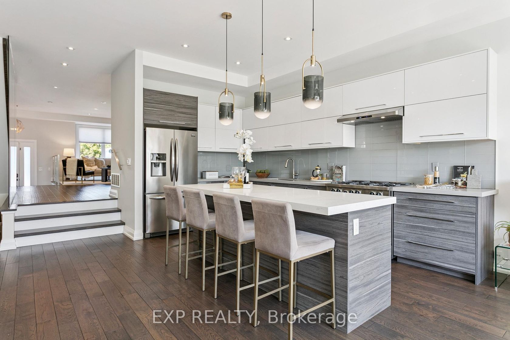 Luxury living awaits in this stunning 2-storey detached home with 2,898 total sq. ft., 3 bedrooms, and 4 bathrooms. The main floor showcases an open-concept layout with a formal living and dining area at the front of the home, complete with wide-plank hardwood, pot lights, large windows that fill the space with natural light, and sleek glass railings. At the heart of the home is a chefs kitchen featuring designer pendant lighting, a full-height light grey backsplash, elegant …two-tone cabinetry with white uppers and charcoal grey lowers, quartz counters, premium stainless steel appliances, a gas range, and a large centre island with seating for four. Soaring 10' ceilings extend through the kitchen and family room, where an electric fireplace adds warmth and style. The adjoining family room flows seamlessly to the outdoors with a walk-out to a private deck and fenced yard perfect for summer gatherings.Upstairs, the primary retreat offers a walk-in closet and a spa-inspired ensuite with heated floors, sleek vanities, modern tile work, premium fixtures, and a second electric fireplace for added comfort. Two additional bedrooms and a full bath complete the upper level.The finished lower level expands the living space with windows, two storage areas, and flexible room ideal for a home office, gym, media room, or play space, plus a 3-pc bath, direct walk-out to the yard, and a built-in garage with interior access and an EV charging outlet. Enjoy the convenience of top-tier colleges nearby, steps to Gus Ryder Pool and Health Club, with quick access to the lake, waterfront trails, Kipling TTC / GO Station, Mimico and Long Branch GO for easy access to downtown, as well as nearby restaurants, and the QEW & 427 highways