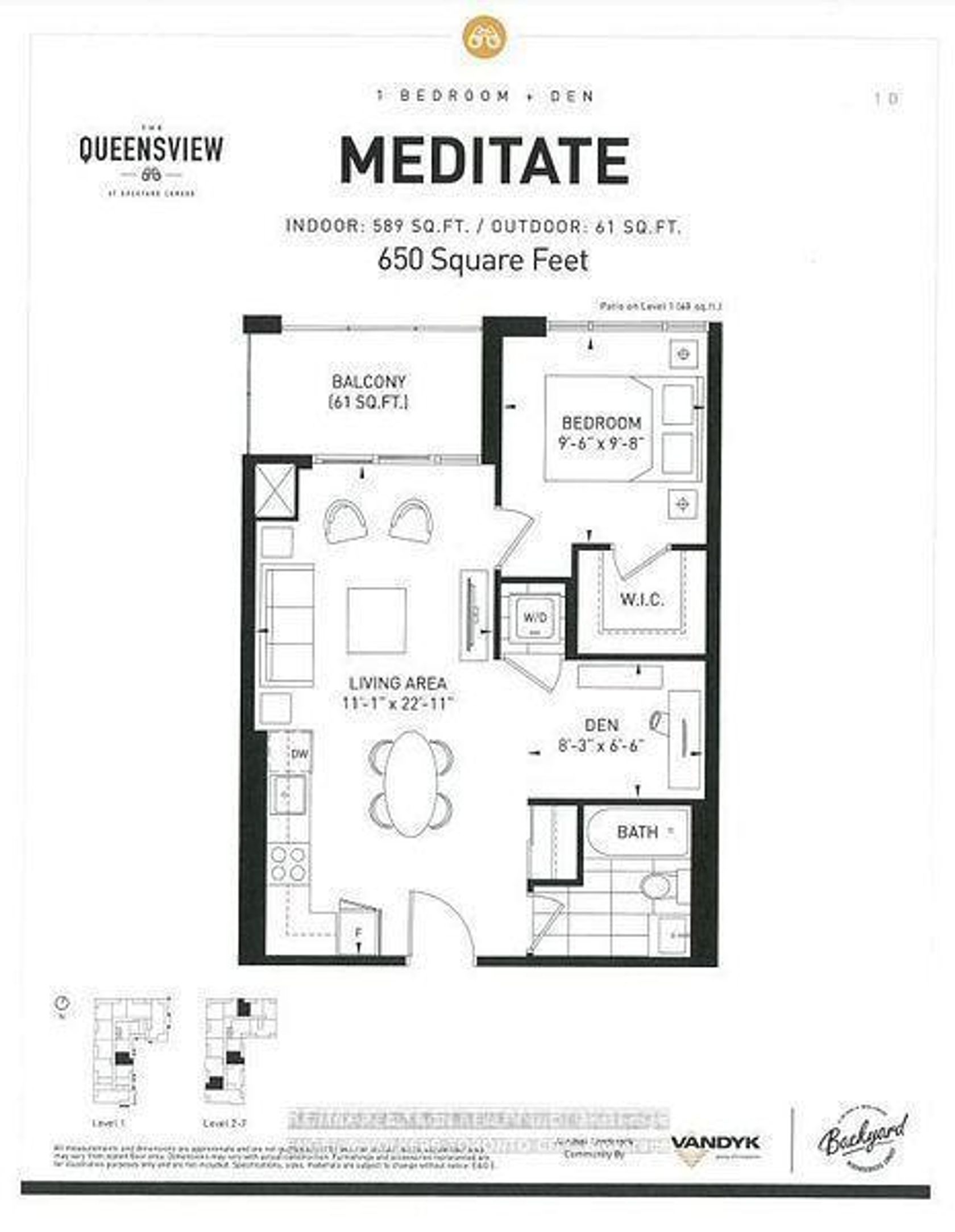 PRICE INCLUDES 2 PARKING SPACES AND 2 LOCKER UNITS. Welcome to the desirable "Queensview - Backyard Condos. Enjoy the sleek look of laminate floors and the durability of Caesar stone countertops in the chef's kitchen, equipped with stainless steel appliances, valance lighting, and a beautiful backsplash, both functional and aesthetically pleasing. The generous den offers flexibility for a home office, studio, or additional lounge space. Residents enjoy access to an array of premium amenities, including a cutting-edge fitness centre, kids play room, full-time concierge,pet spa and 24-hour security. A true blend of contemporary comfort and urban convenience in one of the city's most desirable communities. Total Living Space Is 650 Sq.Ft (589 Sq.Ft. Indoor + 61 Sq.Ft. Balcony). Vendor to consider providing a first mortgage for up to 3 years, fully open, at 3.95% interest on an interest only basis, or 25 year amortization period, at the purchasers choosing.
