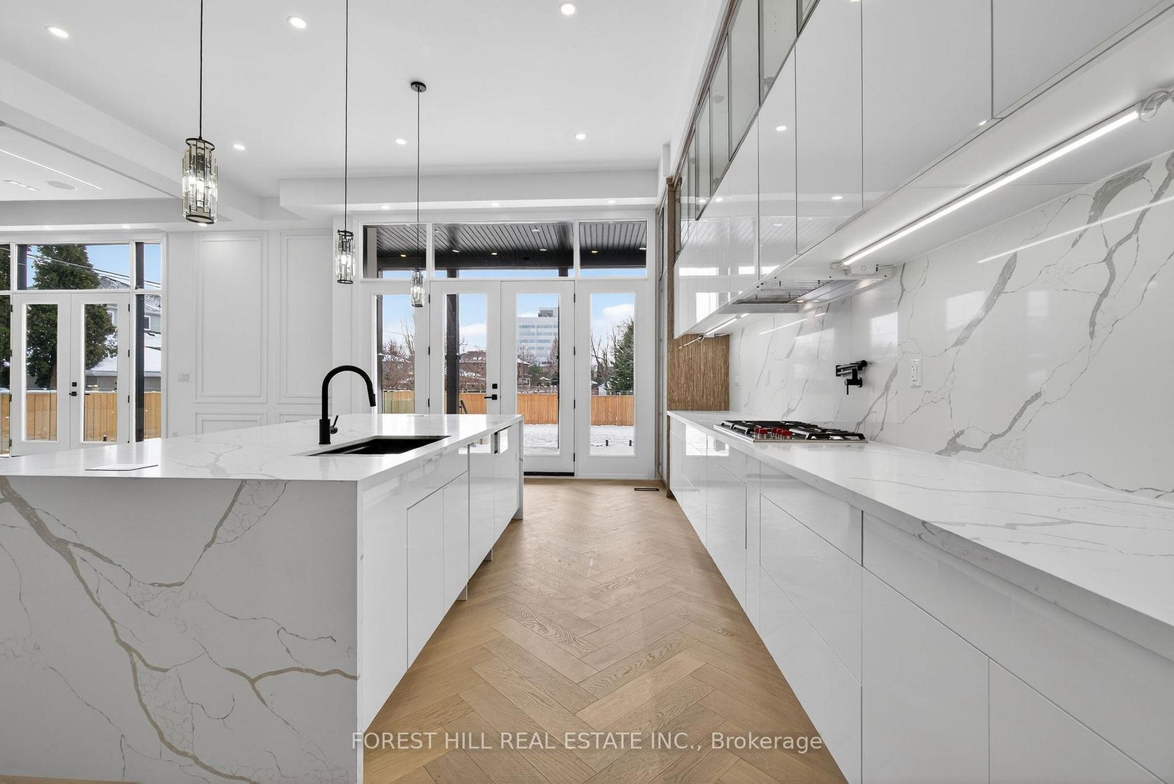 Absolutely stunning modern custom-built home in a prime Toronto location, showcasing exceptional craftsmanship and luxury designer finishes throughout. No expense spared in this architectural masterpiece featuring soaring 24-ft ceilings in the grand open-to-above foyer, dramatic custom millwork, extensive wainscoting and crown moulding, and rich herringbone-style hardwood flooring throughout. Thoughtfully designed with impeccable attention to detail, this home offers 12-ft ce…ilings on the main floor and 11-ft ceilings on the second floor, complemented by custom lighting, built-in surround sound, and high-end decor elements that elevate every space. The open-concept layout seamlessly blends elegance and functionality, highlighted by a stunning 3-sided fireplace connecting the dining and family rooms, a marble feature wall with custom cabinetry, and a designer chef's kitchen with premium panelled JennAir appliances, Wolf cooking package, oversized centre island, and a fully equipped walk-in pantry. Walk out to a beautifully finished composite deck and private patio, perfect for outdoor entertaining. Additional features include a Cambridge elevator servicing all levels, a custom floating wood staircase with glass railing, a main floor office with floor-to-ceiling windows, and a mudroom with built-in storage and marble finishes. The second level offers spacious bedrooms with ensuites and a luxurious primary retreat with fireplace, balcony, spa-inspired 5-piece ensuite, and custom walk-in closet. The fully finished lower level includes a separate apartment setup with walkout, full kitchen, additional bedrooms, recreation space with bar, and second laundry. Complete with 400-amp service, two tankless water heaters, and a total of 7 bedrooms and 8 bathrooms, this extraordinary residence delivers unparalleled luxury living inside and out, all within close proximity to Yorkdale Mall, Allen Road, and Highway 401.