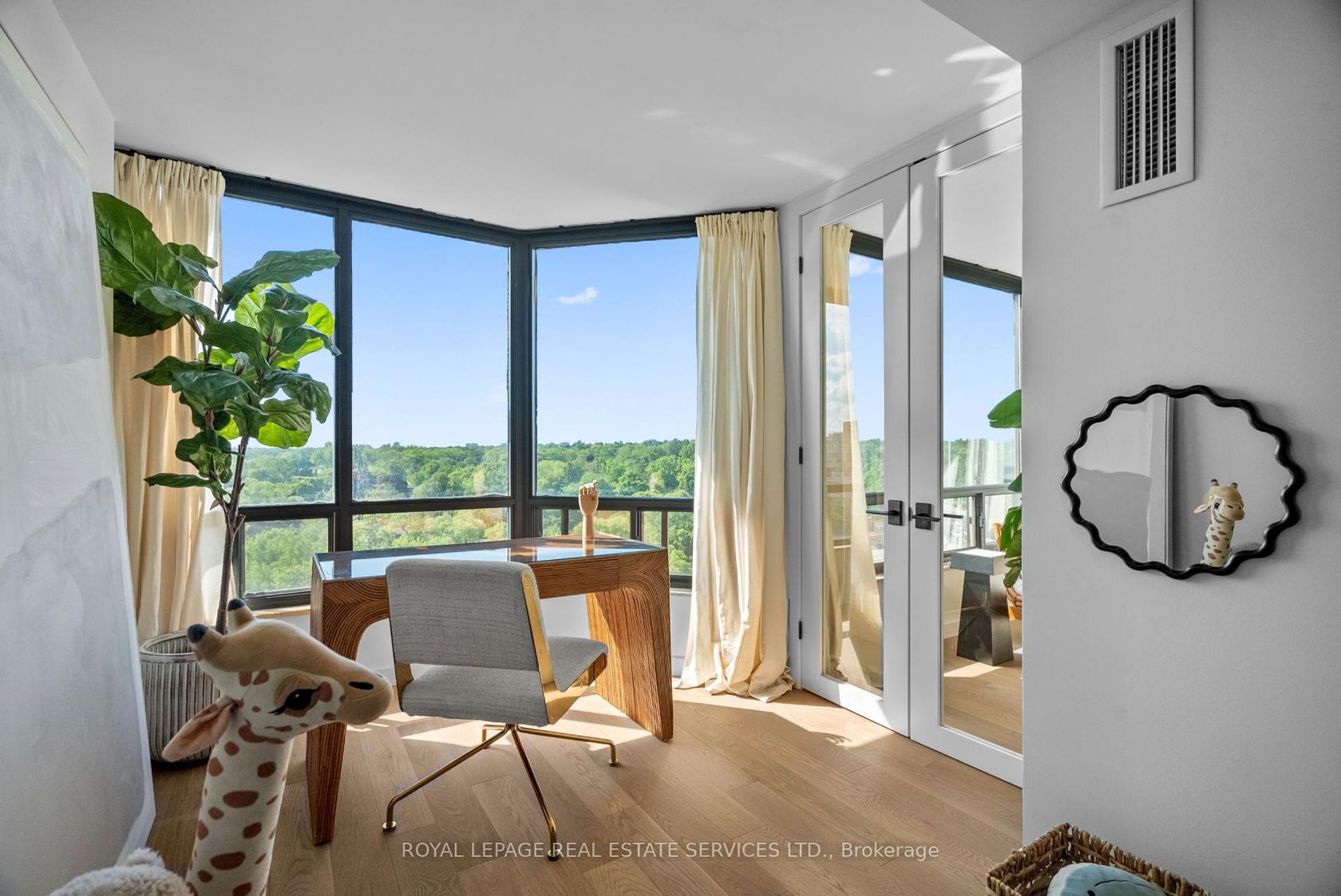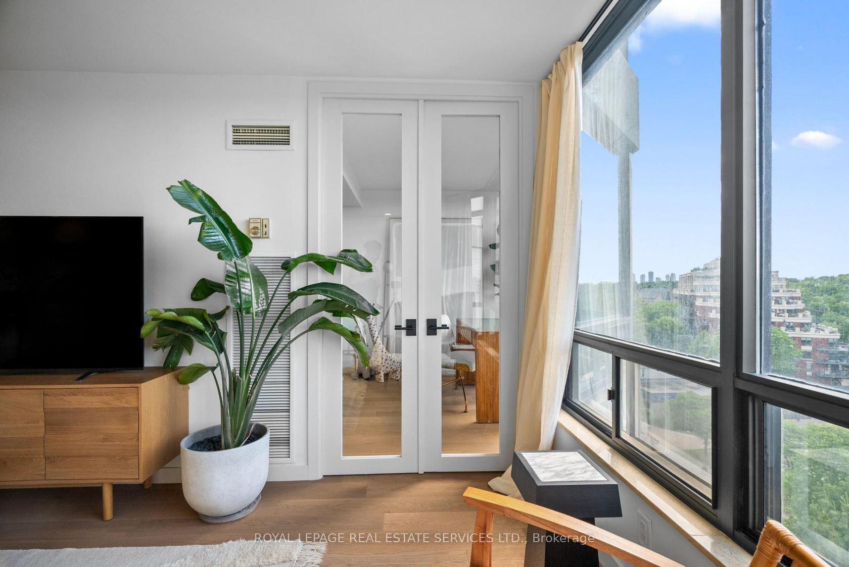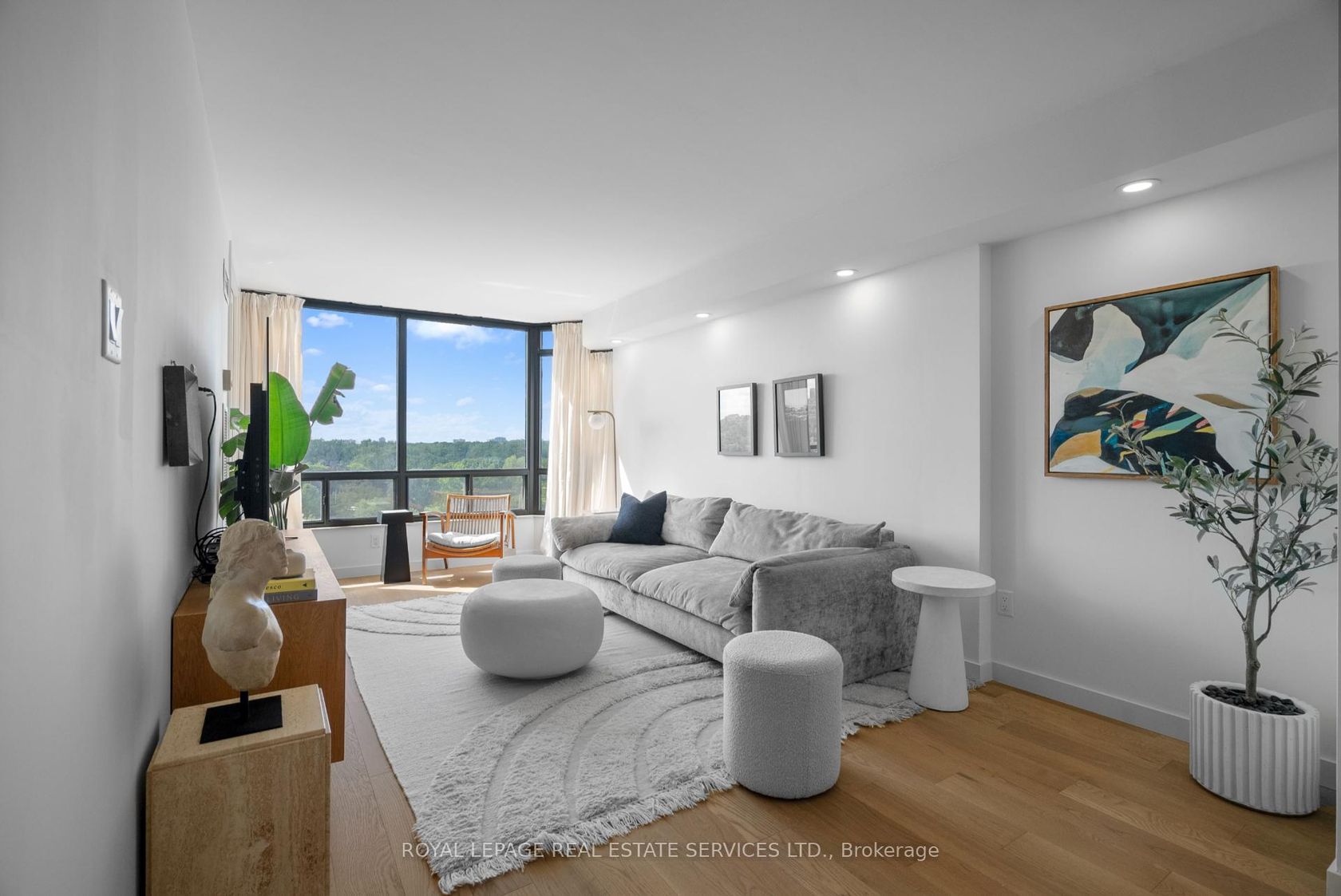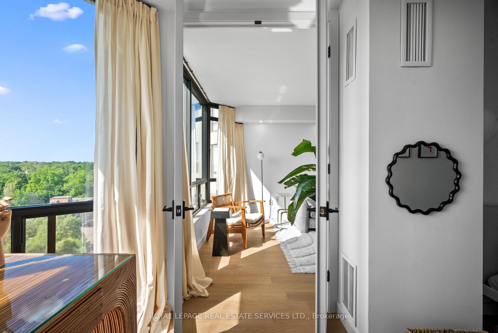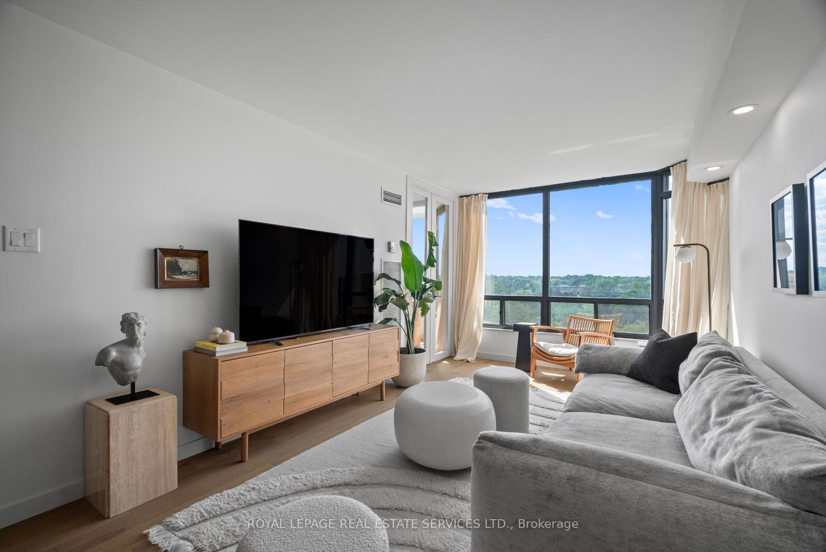 Welcome to a beautifully reimagined suite in the sought-after Barclay Terrace, where thoughtful design meets everyday comfort. This fully renovated residence offers a unique, open-concept layout that maximizes both space and flow, creating an inviting atmosphere that feels as good as it looks. Expansive north-west facing windows frame peaceful treetop views stretching toward Islington Golf & Country Club, filling the home with natural light while offering exceptional privacy.… Smooth ceilings and premium hardwood flooring carry throughout, enhancing the suite's clean, modern aesthetic across approximately 1,060 sqft. At the heart of the home, the kitchen is designed to impress and perform, featuring full-sized appliances, a sleek built-in range hood, quartzite surfaces, and a generous waterfall island with abundant storage. Perfectly positioned between the living and dining areas, it's ideal for both casual living and hosting. The dining area includes a custom built-in with glass cabinetry and integrated lighting, comfortably accommodating both intimate dinners and larger gatherings. In the living room, elegant French doors open to a flexible second bedroom or home office, offering versatility for today's lifestyle. The primary bedroom is a calm retreat with room for a king-sized bed, custom shelving, and a refined 3pc ensuite with a walk-in shower. A second full bathroom features an oak vanity, marble countertop, and tub, blending style with practicality. A standout feature is the dedicated laundry room, thoughtfully designed with a large quartzite counter and excellent storage-bringing ease and organization to daily routine. Residents enjoy exceptional amenities including 24-hour concierge, indoor pool and hot tub, sauna, tennis and pickleball courts, squash, fitness centre, library, billiards room, and beautifully maintained outdoor spaces with BBQs and a courtyard. A true sense of community, making Barclay Terrace a place residents are proud to call home.