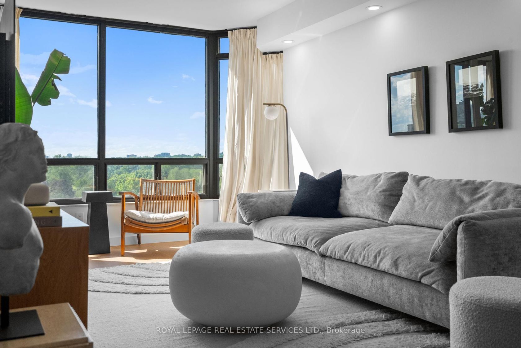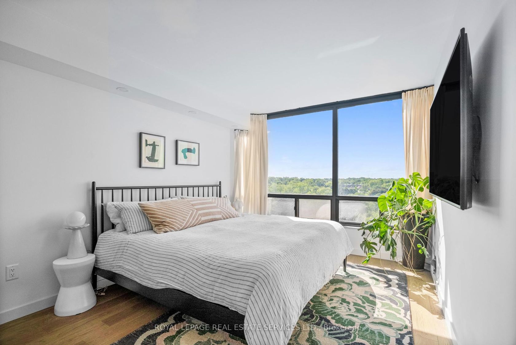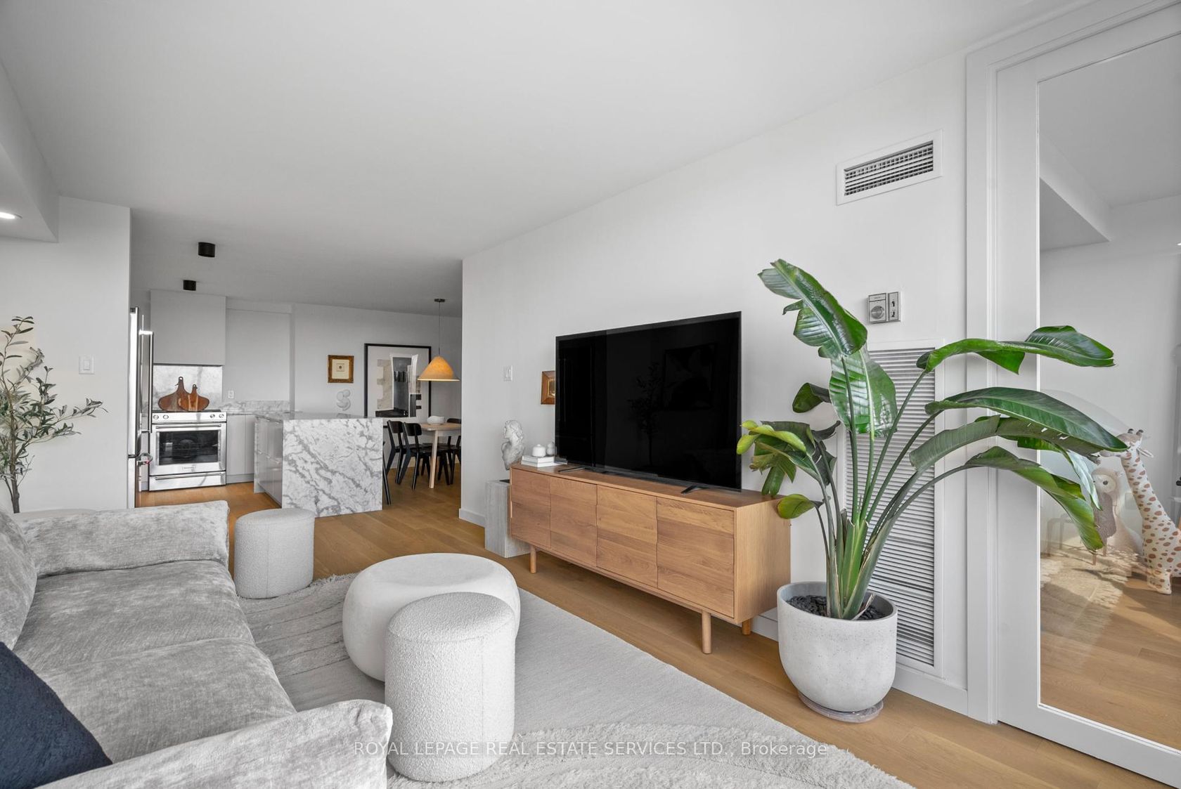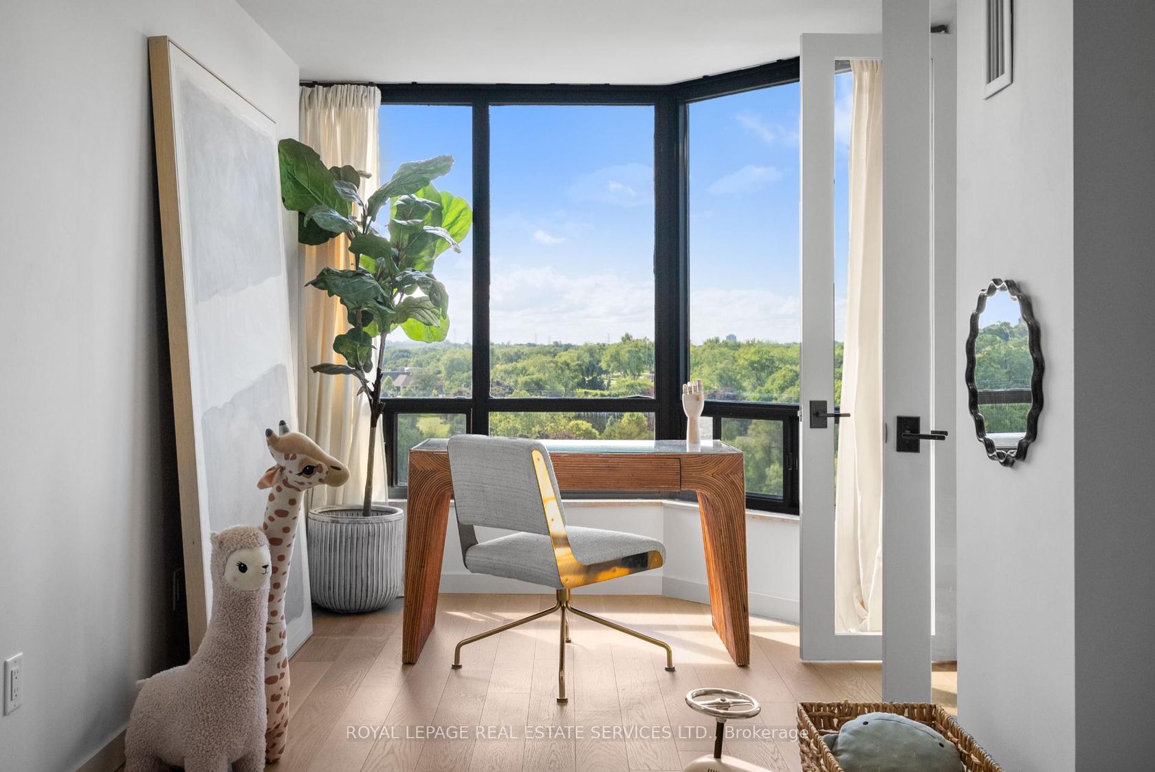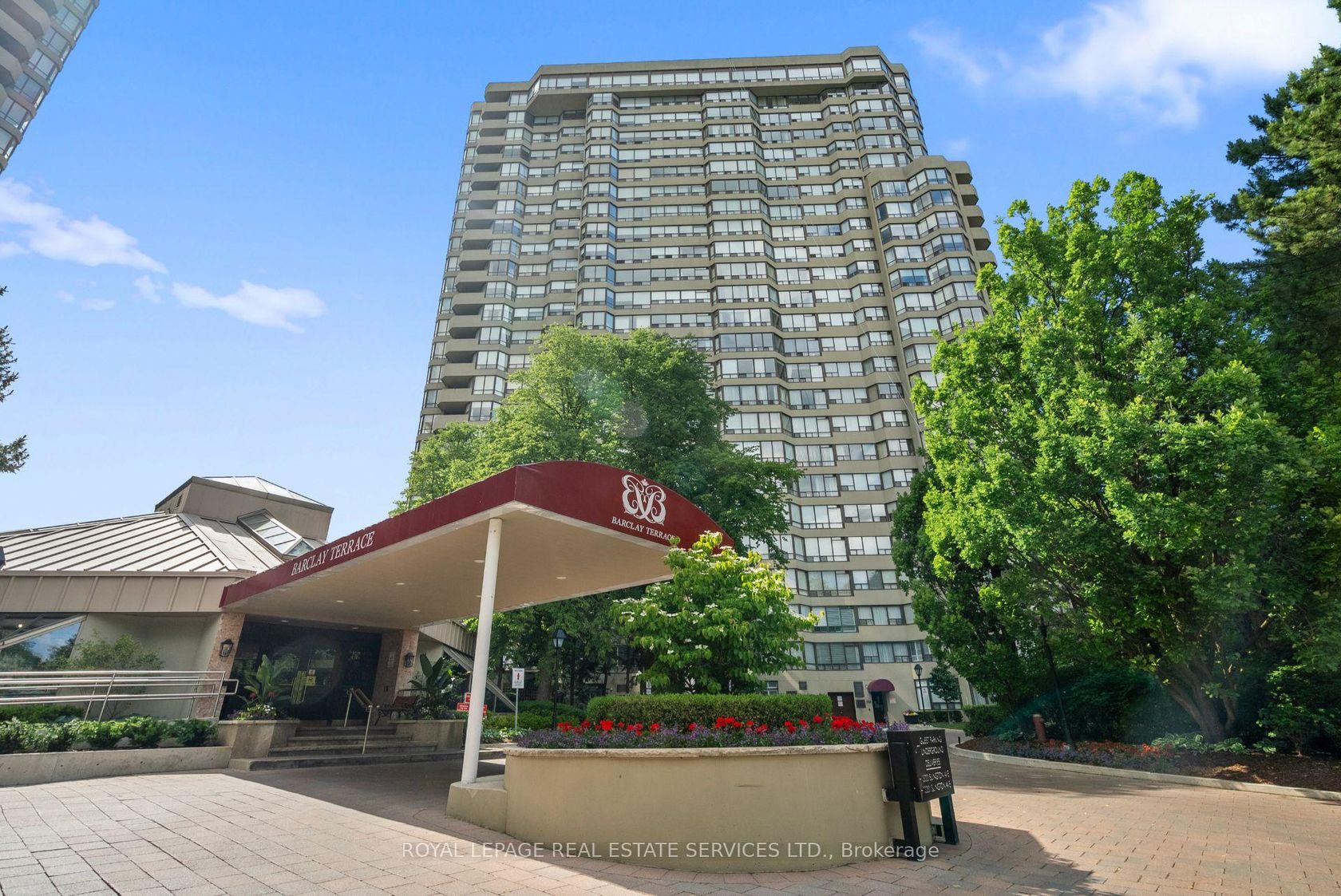 Welcome to a beautifully reimagined suite in the sought-after Barclay Terrace, where thoughtful design meets everyday comfort. This fully renovated residence offers a unique, open-concept layout that maximizes both space and flow, creating an inviting atmosphere that feels as good as it looks. Expansive north-west facing windows frame peaceful treetop views stretching toward Islington Golf & Country Club, filling the home with natural light while offering exceptional privacy.… Smooth ceilings and premium hardwood flooring carry throughout, enhancing the suite's clean, modern aesthetic across approximately 1,060 sqft. At the heart of the home, the kitchen is designed to impress and perform, featuring full-sized appliances, a sleek built-in range hood, quartzite surfaces, and a generous waterfall island with abundant storage. Perfectly positioned between the living and dining areas, it's ideal for both casual living and hosting. The dining area includes a custom built-in with glass cabinetry and integrated lighting, comfortably accommodating both intimate dinners and larger gatherings. In the living room, elegant French doors open to a flexible second bedroom or home office, offering versatility for today's lifestyle. The primary bedroom is a calm retreat with room for a king-sized bed, custom shelving, and a refined 3pc ensuite with a walk-in shower. A second full bathroom features an oak vanity, marble countertop, and tub, blending style with practicality. A standout feature is the dedicated laundry room, thoughtfully designed with a large quartzite counter and excellent storage-bringing ease and organization to daily routine. Residents enjoy exceptional amenities including 24-hour concierge, indoor pool and hot tub, sauna, tennis and pickleball courts, squash, fitness centre, library, billiards room, and beautifully maintained outdoor spaces with BBQs and a courtyard. A true sense of community, making Barclay Terrace a place residents are proud to call home.