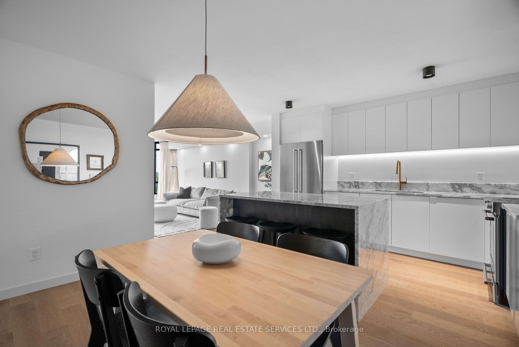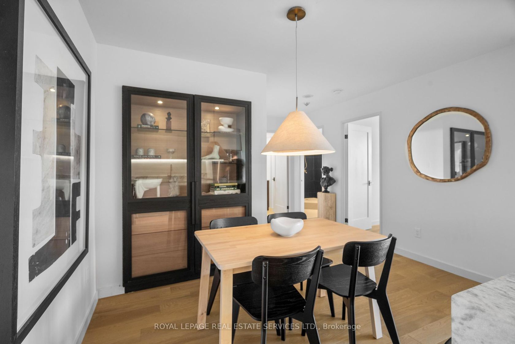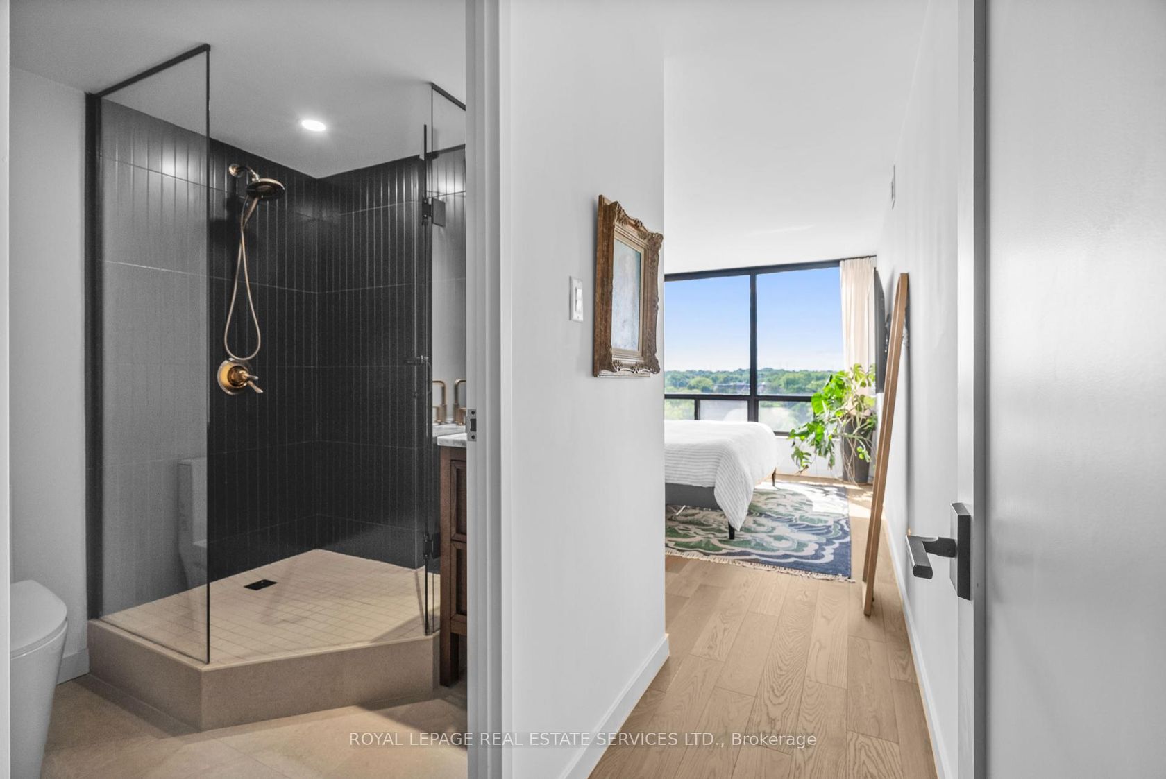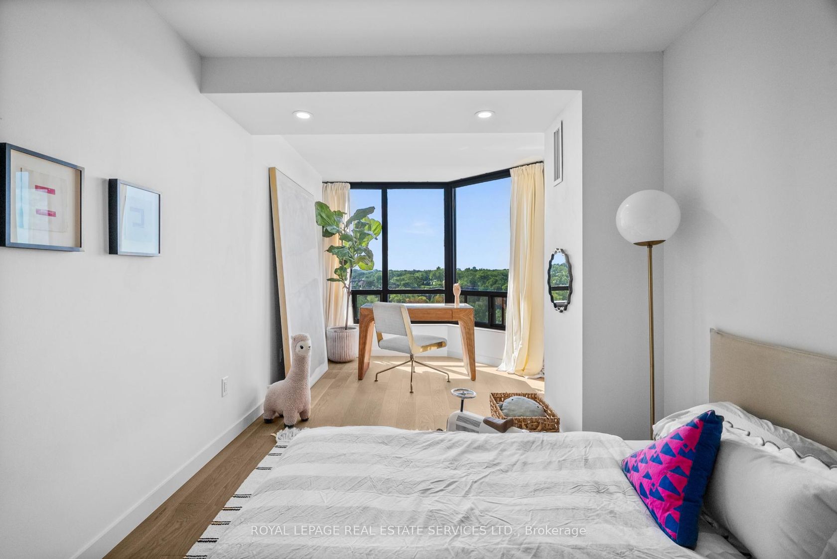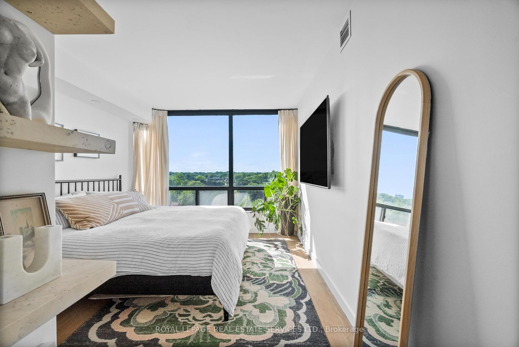 Welcome to a beautifully reimagined suite in the sought-after Barclay Terrace, where thoughtful design meets everyday comfort. This fully renovated residence offers a unique, open-concept layout that maximizes both space and flow, creating an inviting atmosphere that feels as good as it looks. Expansive north-west facing windows frame peaceful treetop views stretching toward Islington Golf & Country Club, filling the home with natural light while offering exceptional privacy.… Smooth ceilings and premium hardwood flooring carry throughout, enhancing the suite's clean, modern aesthetic across approximately 1,060 sqft. At the heart of the home, the kitchen is designed to impress and perform, featuring full-sized appliances, a sleek built-in range hood, quartzite surfaces, and a generous waterfall island with abundant storage. Perfectly positioned between the living and dining areas, it's ideal for both casual living and hosting. The dining area includes a custom built-in with glass cabinetry and integrated lighting, comfortably accommodating both intimate dinners and larger gatherings. In the living room, elegant French doors open to a flexible second bedroom or home office, offering versatility for today's lifestyle. The primary bedroom is a calm retreat with room for a king-sized bed, custom shelving, and a refined 3pc ensuite with a walk-in shower. A second full bathroom features an oak vanity, marble countertop, and tub, blending style with practicality. A standout feature is the dedicated laundry room, thoughtfully designed with a large quartzite counter and excellent storage-bringing ease and organization to daily routine. Residents enjoy exceptional amenities including 24-hour concierge, indoor pool and hot tub, sauna, tennis and pickleball courts, squash, fitness centre, library, billiards room, and beautifully maintained outdoor spaces with BBQs and a courtyard. A true sense of community, making Barclay Terrace a place residents are proud to call home.